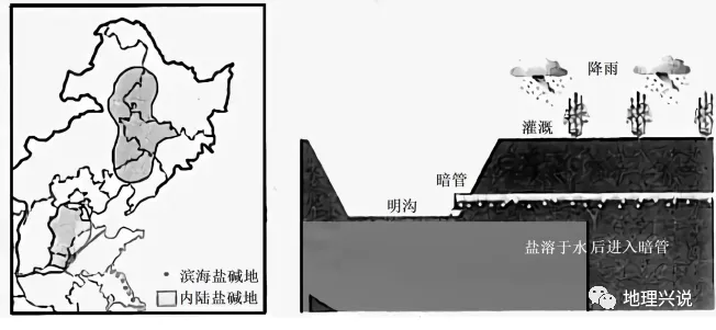 各种盐碱土是在一定的自然条件下形成的,是各种易溶性盐类在地面作水平方向与垂直方向的重新分配,从而使盐分在集盐地区的土壤表层逐渐积聚起来。“暗管改碱排盐”是根据“盐随水来,盐随水去”这一水盐运动规律,把带有小孔的管道埋于地表以下1~2m的深度,结合灌溉淋洗,把土壤表层的盐分溶解排走,让盐碱地“活”起来。下图示意我国部分地区盐碱地分布和“暗管改碱排盐”技术纵切面。