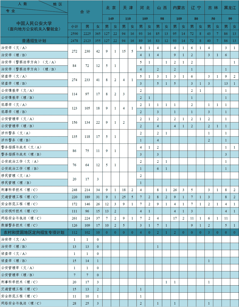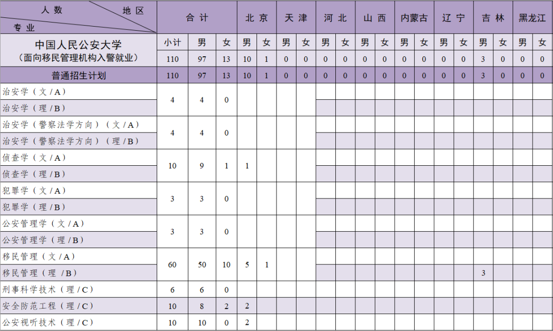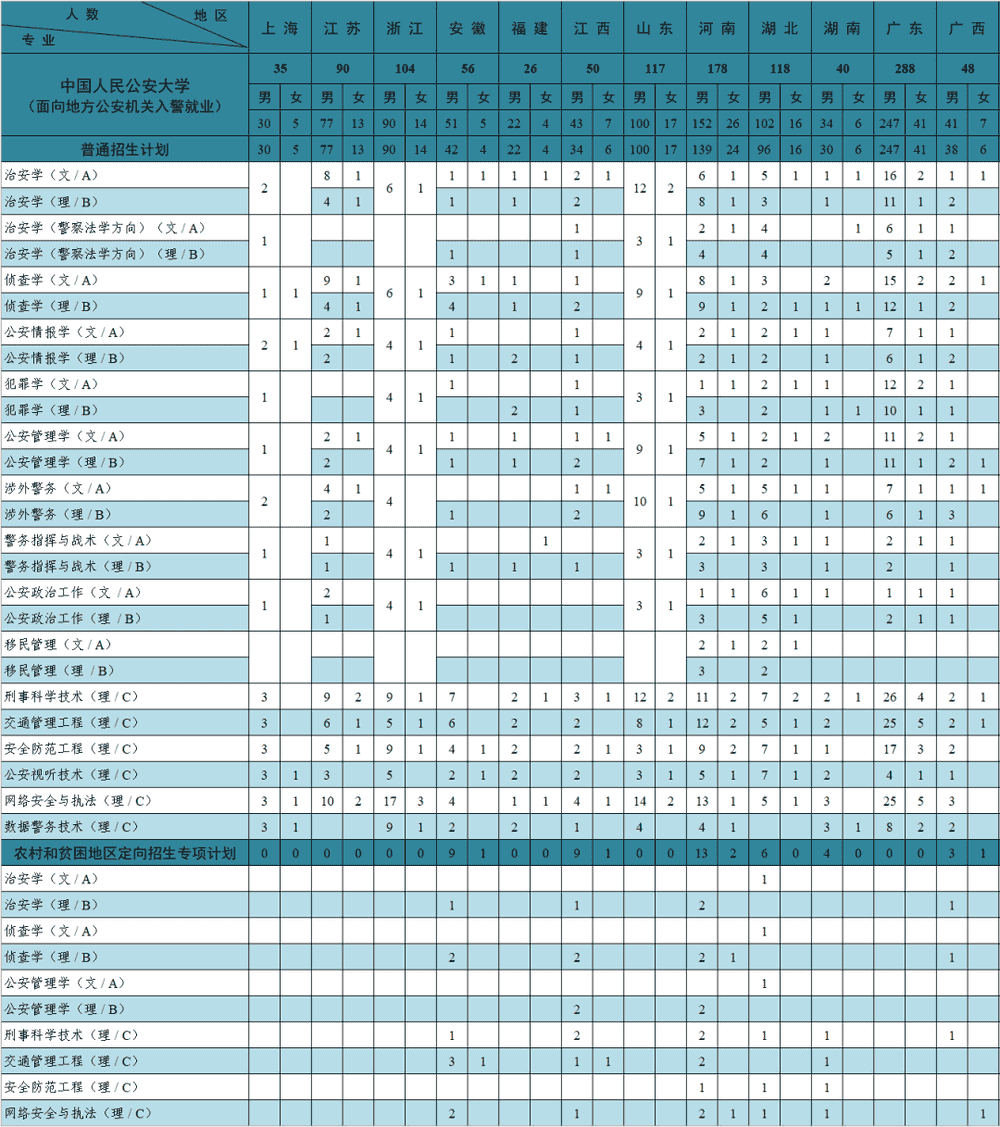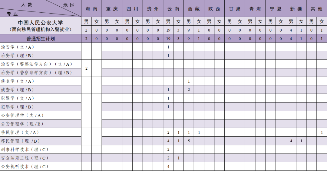 4、新疆计划中含新疆高中班计划 16 人。其中:男生 14 人,即治安学(文)1 人、治安学(理)1 人、治安学(警察法学方向)(文)1 人、治安学(警察法学方向)(理)1 人、侦查学(文)1 人、侦查学(理)1 人、公安管理学(文)1 人、公安管理学(理)2 人、公安政治工作(文)1 人、公安政治工作(理)1 人、交通管理工程(理)3 人;女生 2 人,即治安学(理)1 人、侦查学(理)1 人。