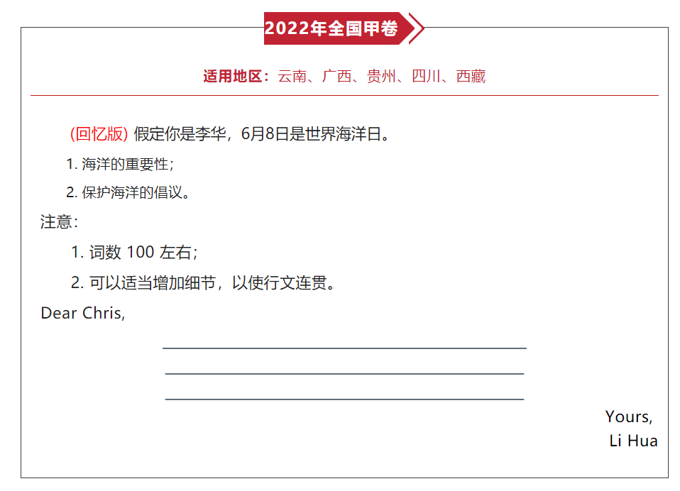 (回忆版) 假定你是李华,6月8日是世界海洋日。