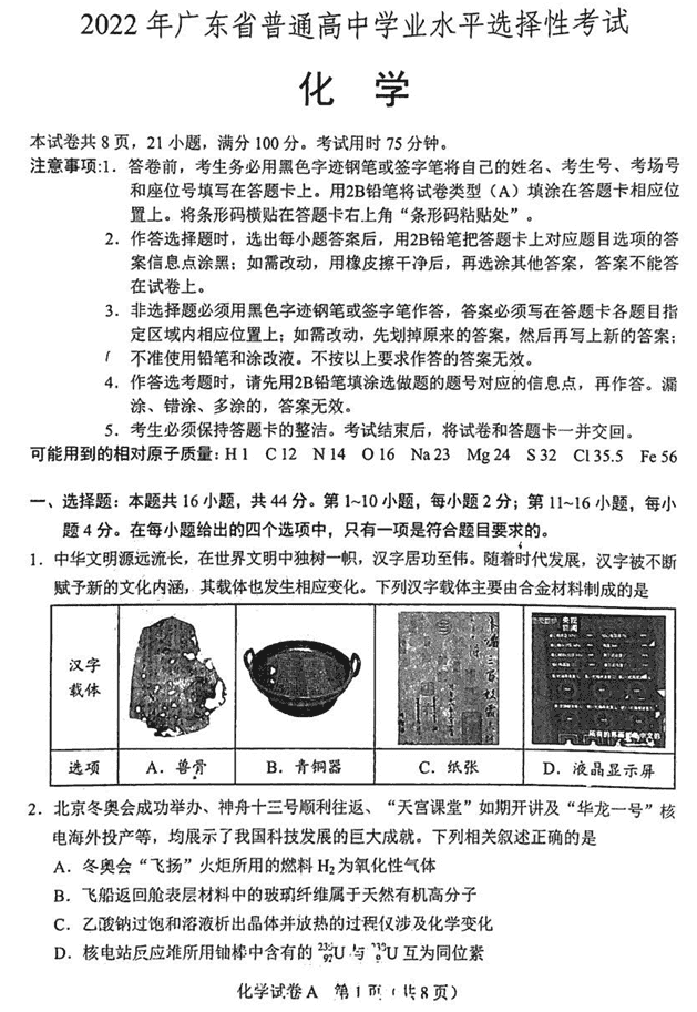 2022年广东高考化学试卷使用是本省命题卷,2022年广东高考化学试卷真题已公布,答案暂未公开,待2022年广东高考化学答案公布后,本站会第一时间更新2022广东高考化学试卷与答案,供广大考生及家长对照、估分、模拟使用。