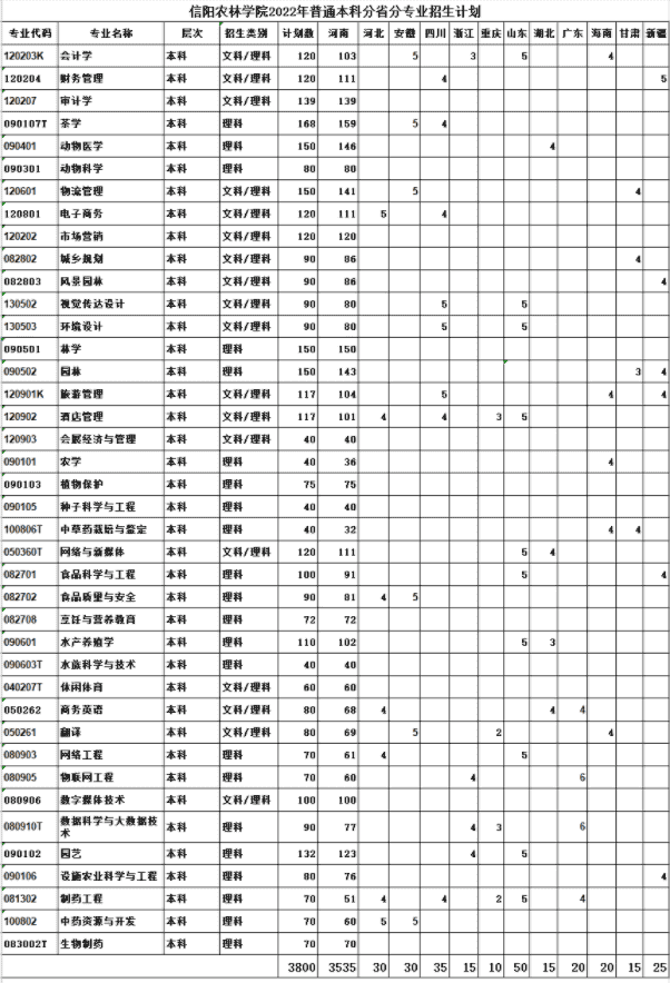2022年信阳农林学院各省招生计划及招生人数