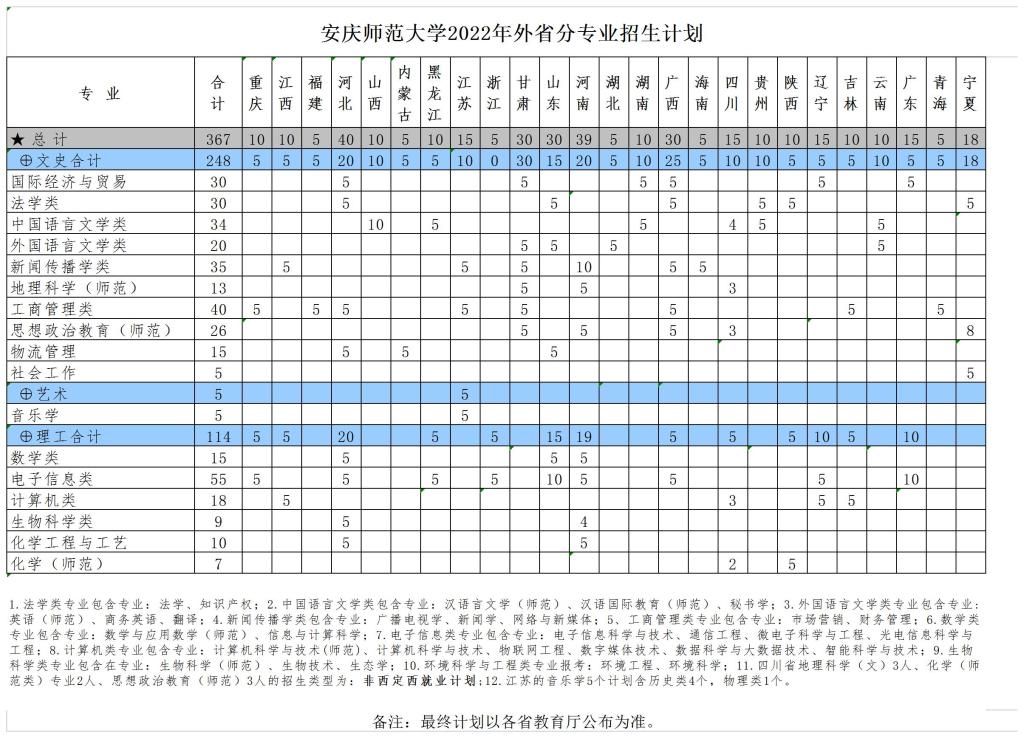 2022年安庆师范大学各省招生计划及招生人数