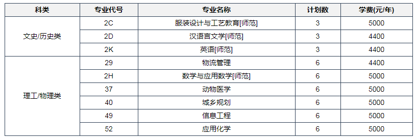 2022年河南科技学院在江苏招生计划中教育学专业招生3人、英语专业招生3人,在浙江招生计划中生物工程专业招生6人、法学专业招生3人,在江西招生计划中法学专业招生3人、生物技术专业招生5人。