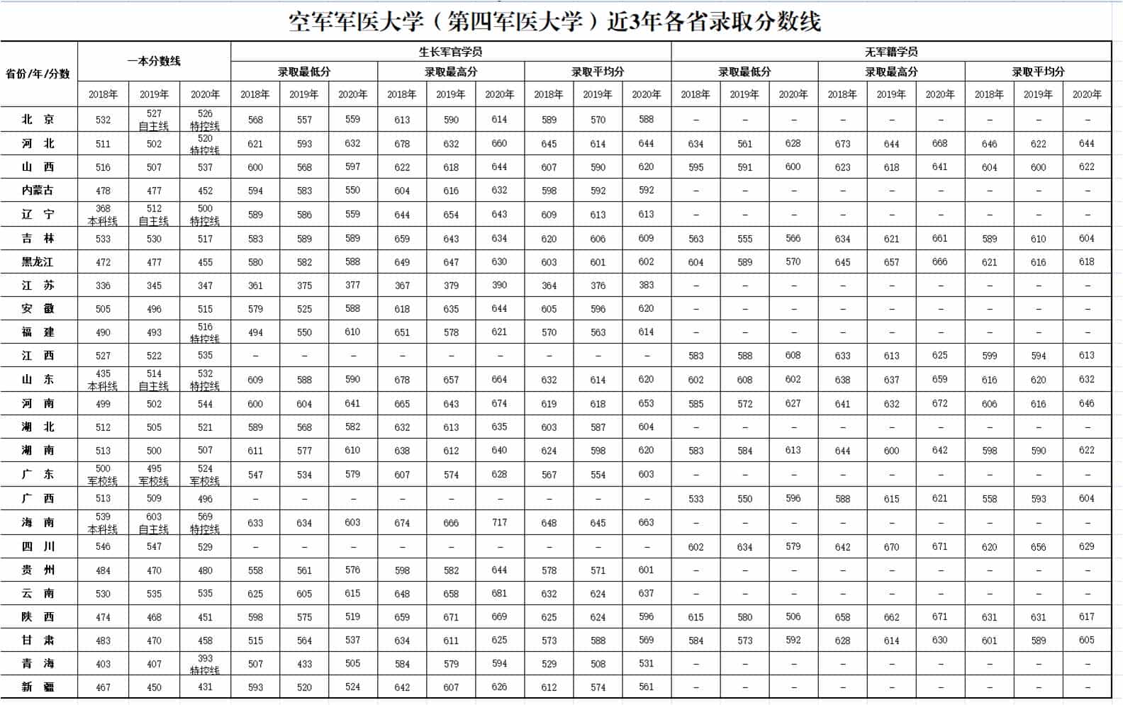 2018-2020年空军军医大学录取分数线