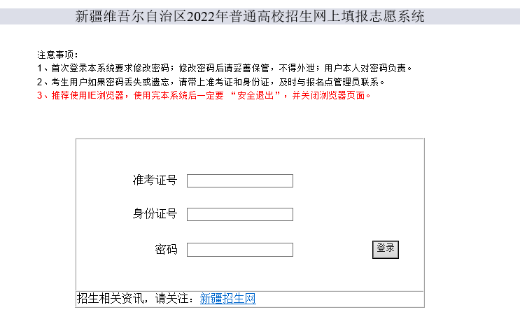 根据《关于做好自治区2022年普通高校招生网上填报志愿工作的通知》要求,我区2022年普通高考网上填报志愿系统拟于6月25日12时正式开通,考生可登录新疆招生网(www.xjzk.gov.cn)填报高考志愿。考生须输入本人准考证号、身份证号及网上信息初始密码登录高考志愿填报系统,首次登录后将强制要求修改个人密码,方可进行其他操作。