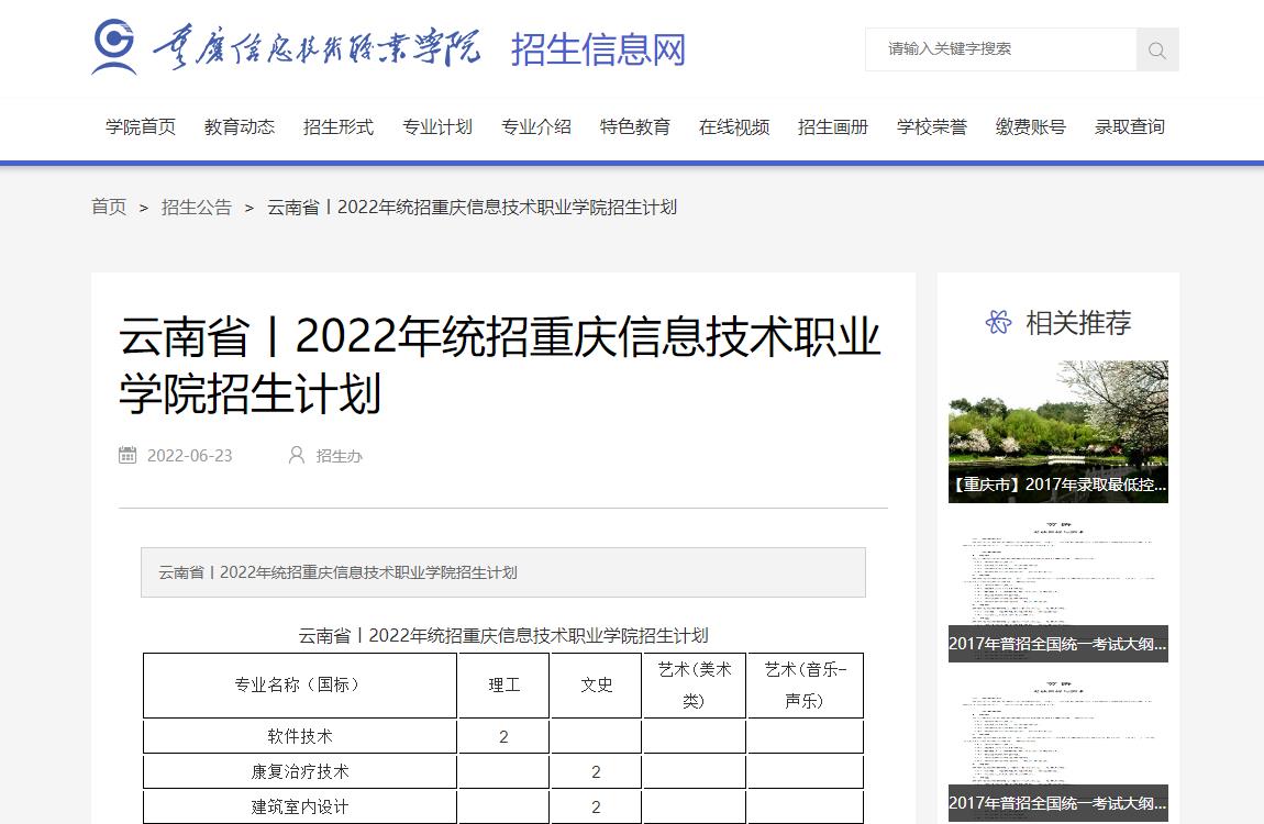 云南省丨2022年统招重庆信息技术职业学院招生计划
