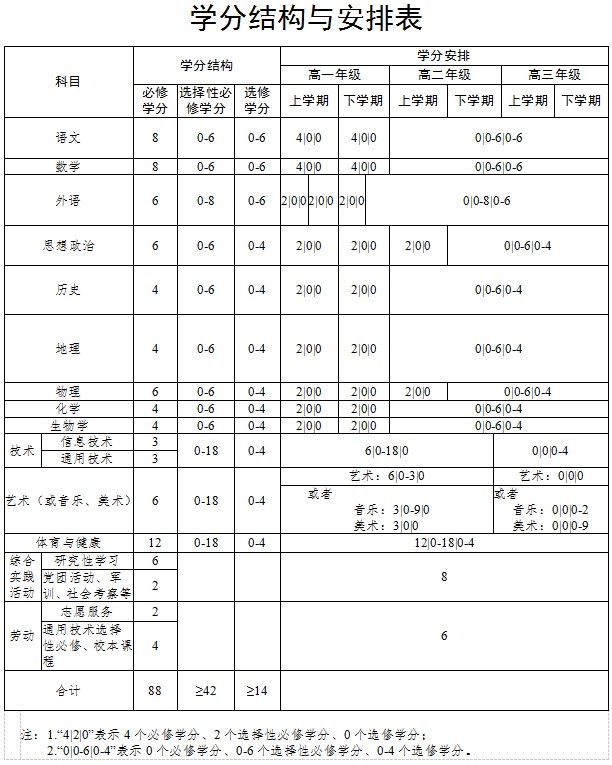 1.高中学生完成相应课程规定课时的学习并考核合格,即可获得相应学分。学生三年中获得88个必修学分,在选择性必修课程中获得不少于42学分(其中参加高考的学生,语文、数学、外语科目以及选择作为学业水平选择性考试的科目应修满上限学分;对于不选考的科目,鼓励学生结合兴趣爱好选修部分模块),在选修课程(含各科目选修模块和专题教育)中获得不少于14学分,总学分达到144方可毕业。学生可以根据自己的个性发展和升学考试需要,结合兴趣爱好,选修更多课程,获得更多学分。