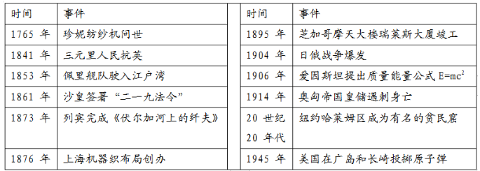 论证:1765 年,珍妮纺纱机问世,揭开了英国工业革命的序幕,随着工业革命的开展,英国等西方国家资本主义生产力出现了划时代的飞跃,机器大生产取代了工场手工业。而工业文明向外拓展也推动了人类社会近代化进程。在工业革命的推动下,1861 年,俄国沙皇亚历山大二世签署“二一九法令”,进行农奴制改革,废除了农奴制,使俄国走上了资本主义发展道。近代中国在第二次战争后,曾国藩,李鸿章等为代表的洋务派官员主张学习西方先进技术维护清朝封建统治,开展了一场“师夷长技以自强”的洋务运动,如创办了上海机器织布局等一批近代企业,开启了中国的近代化。