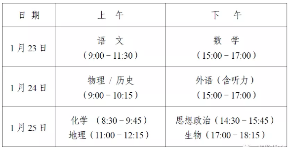 按照教育部统一安排,适应性考试定于2021年1月23日—1月25日举行,各科目具体考试时间安排如下。