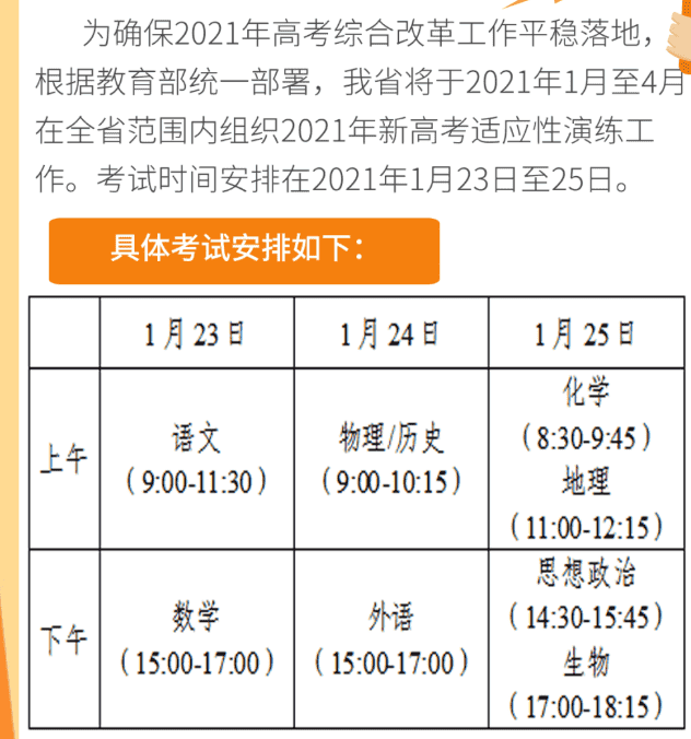 统一高考考试科目的考试安排以教育部统一公布的安排为准,如有调整,我省学业水平选择性考试科目的考试安排相应调整。
