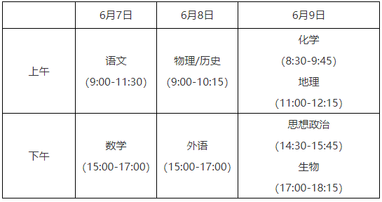 考试时间安排在6月7—9日。语文科目考试时长为150分钟,数学、外语科目考试时长均为120分钟,学业水平选择性考试科目每科考试时长均为75分钟。具体考试安排为: