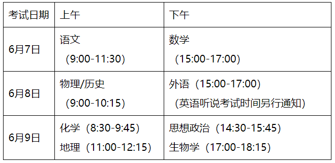 注:全国统一高考科目考试时间安排以教育部公布的为准,如有调整,我省选择性考试科目的考试安排将做相应调整。