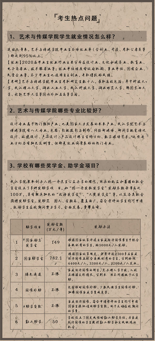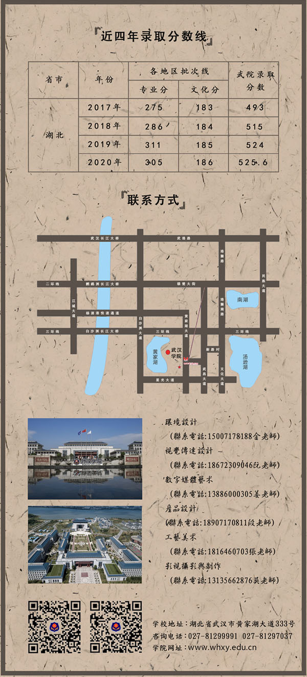 武汉学院2021年艺术类专业招生简章 时间:2021-01-10 08:31 招生简章 武汉学院2021年艺术类专业招生简章已经公布,小编在本文中整理里相关内容,快来看看吧!武汉学院2021年艺术类专业招生简章