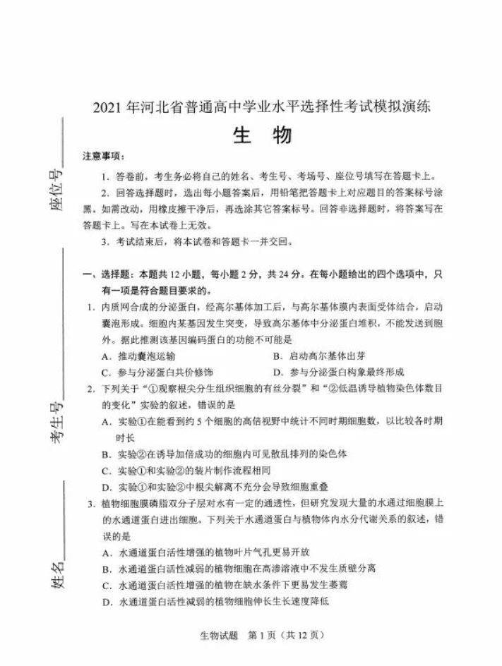 河北高考理综试题搜索2021河北八省联考生物试卷及答案解析2021-02-02 11:49:46文/陈宇航2021河北八省联考生物试卷<" />