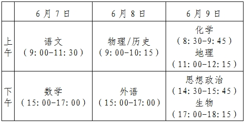统一高考科目的考试时间以教育部公布为准,如有调整,我省选择性考试科目的考试时间相应调整。