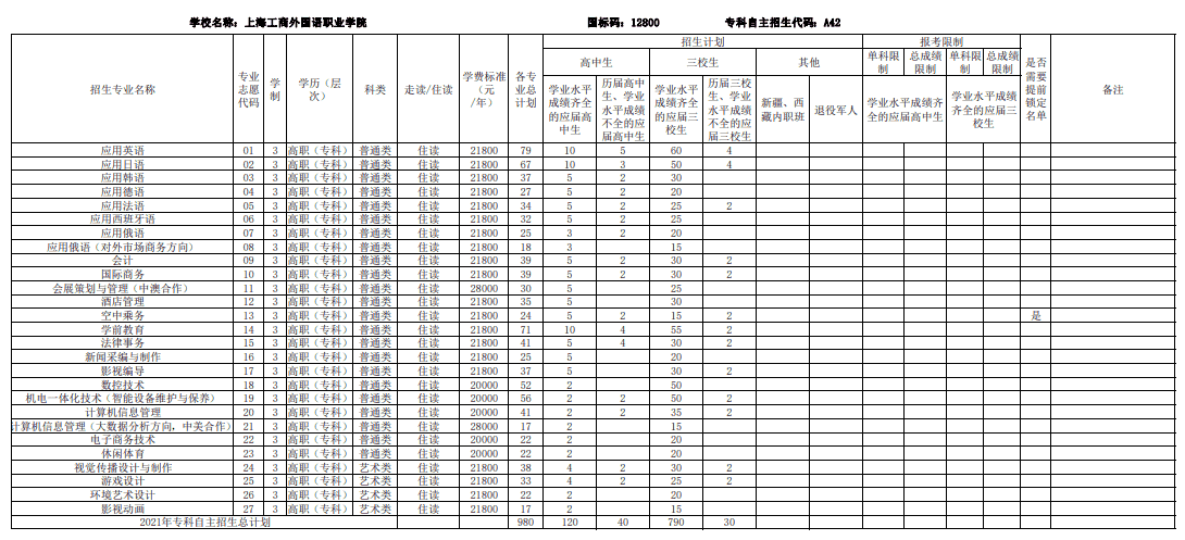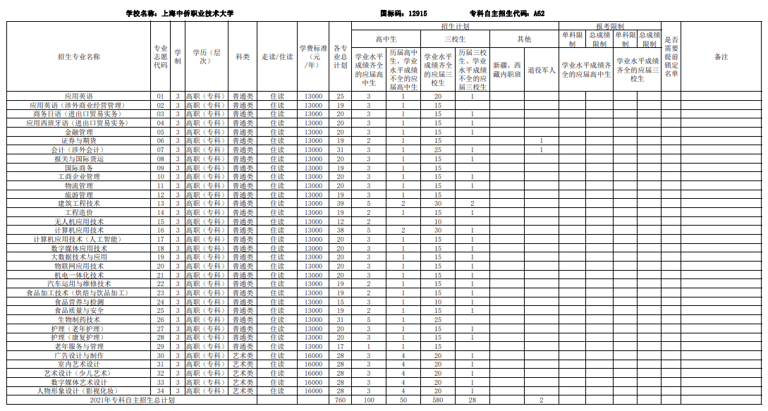 2021年专科自主招生专业目录