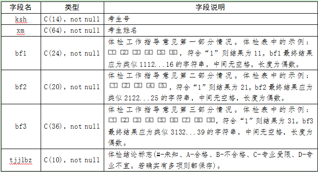 | 65 | Tjjldm | Char | 1 | Not Null | 体检结论代码(1-合格,2-专业受限,3-不合格) |
