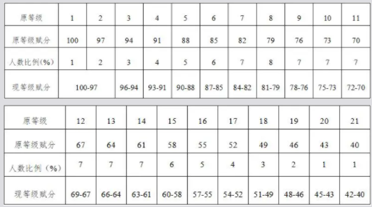 经多次专家研究、多方论证,将原赋分办法的21个等级划分为20个赋分区间,赋分分差由3分细化为1分。原先的第1(1%,100分)、第2(2%,97分)两个等级合并为1个赋分区间,其余不变。第1区间为100-97,第2区间为96-94,第3区间为93-91,以此类推,第20区间为42-40。