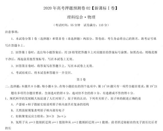 2020年全国高考理综押题预测物理试题