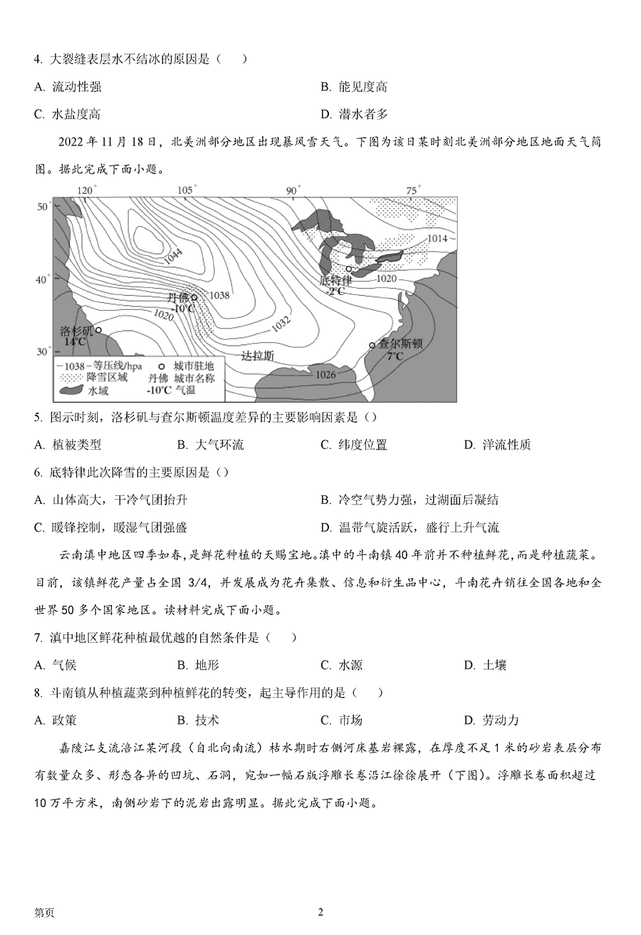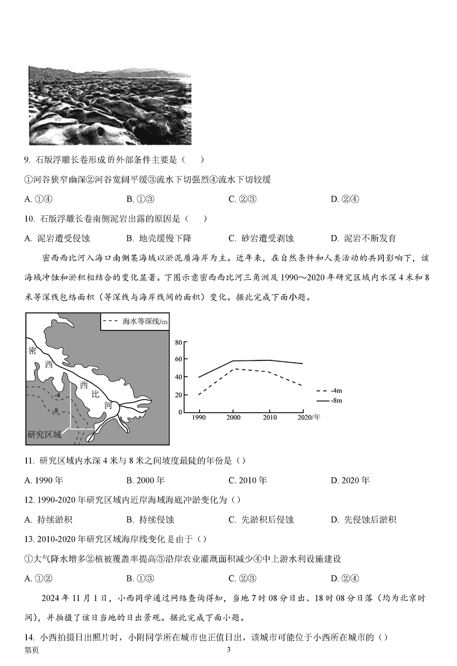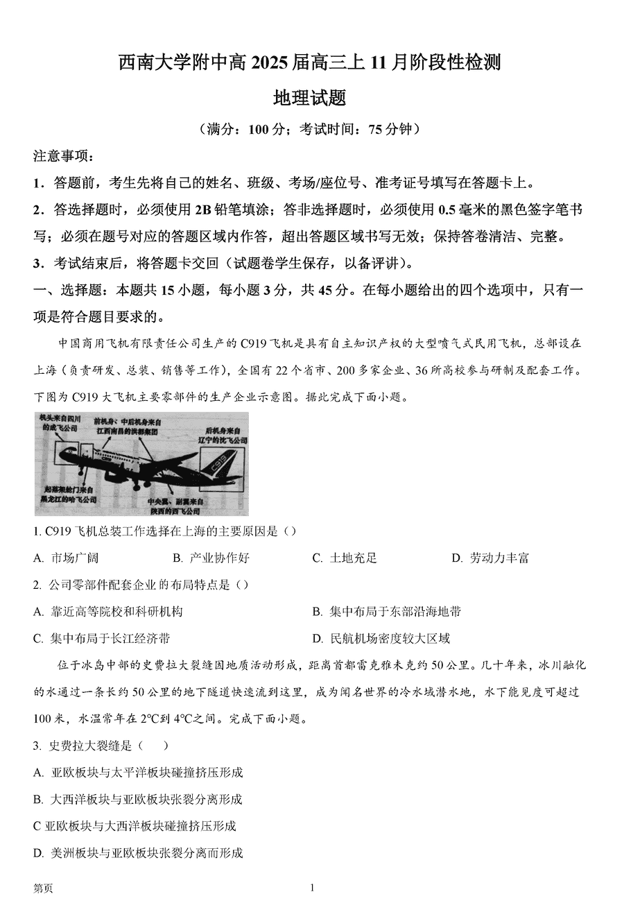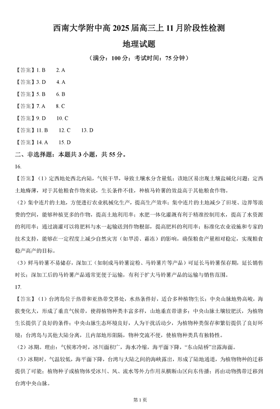 西南大学附中2025届高三上11月阶段性检测地理试题及答案