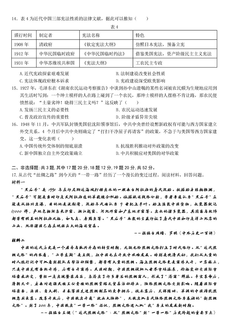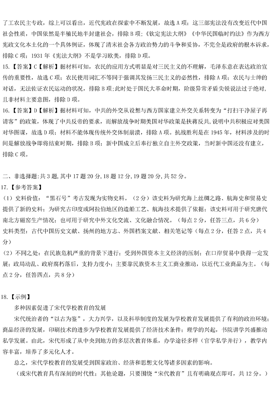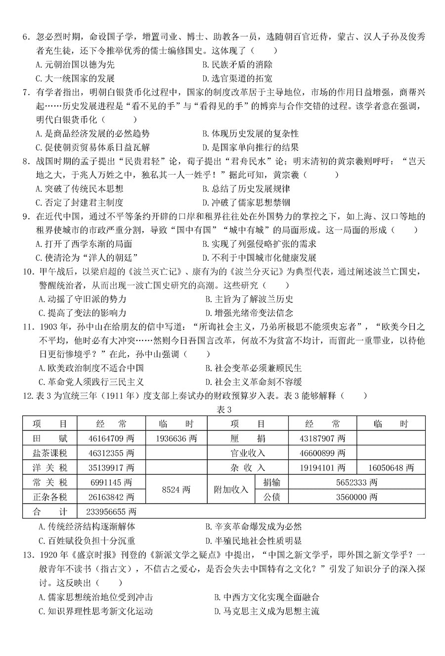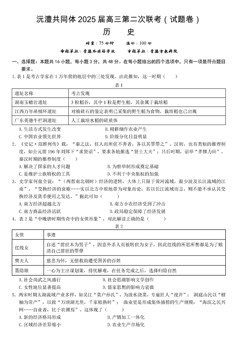 湖南沅澧共同体2025届高三第二次联考历史试题及答案