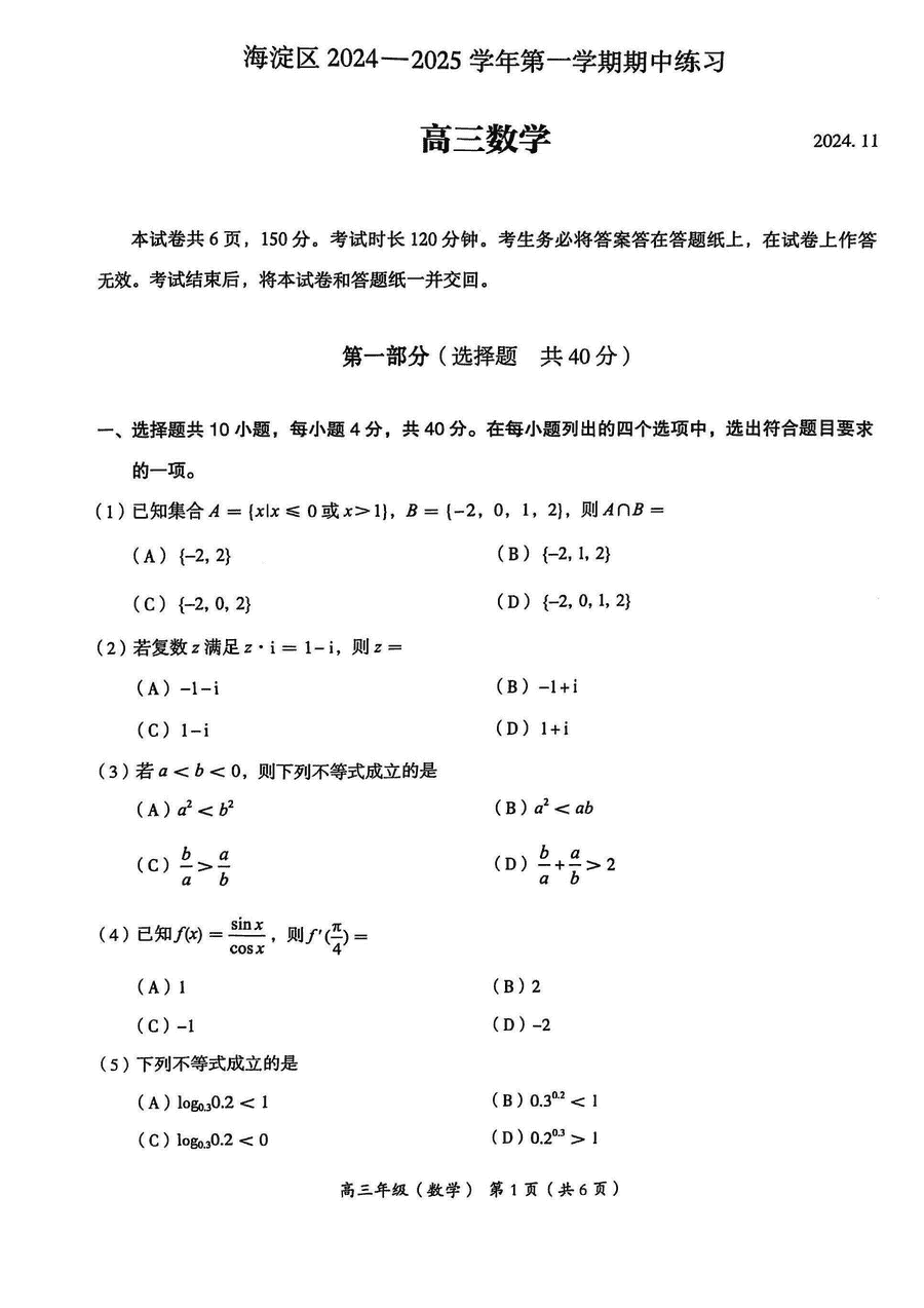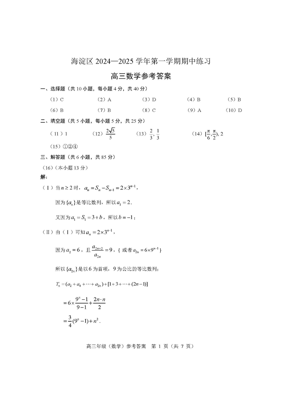 北京海淀区2024-2025学年高三上学期期中数字试题及答案