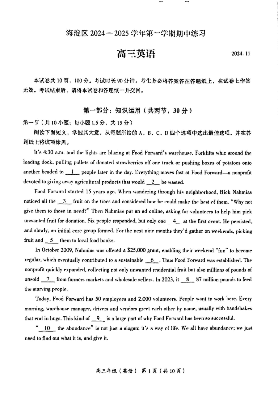 北京海淀区2024-2025学年高三上学期期中英语试题及答案