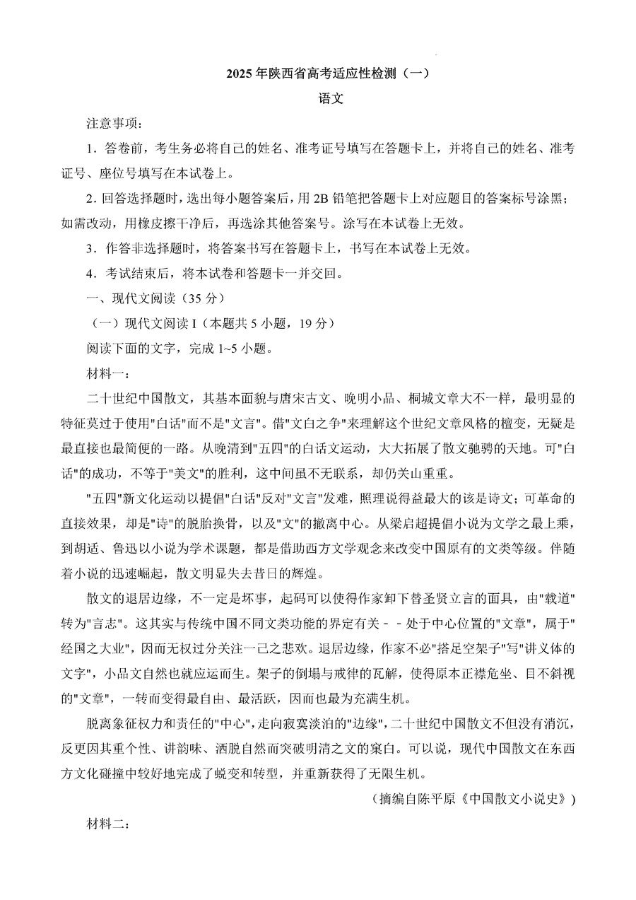 陕西省2025届高考适应性检测一语文试题及答案 时间:2024-11-13 15:03 陕西 语文试题 陕西省2025届高考适应性检测一语文考试已于近日开考,为方便考生考后及时查看考试情况,查漏补缺、弥补不足,本文整理了试题答案解析相关信息! 汇总:陕西省2025届高考适应性检测一试题及答案汇总 语文试题及答案解析