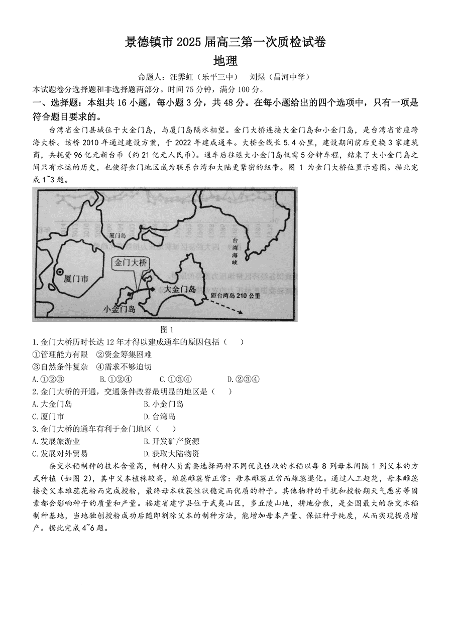 2025届景德镇高三第一次质检地理试题及答案 时间:2024-11-13 15:10 江西 文综试题 2025届景德镇高三第一次质检地理考试已于近日开考,为方便考生考后及时查看考试情况,查漏补缺、弥补不足,本文整理了试题答案解析相关信息! 汇总:江西省景德镇市2025届高三第一次质检试题及答案汇总 地理试题及答案解析