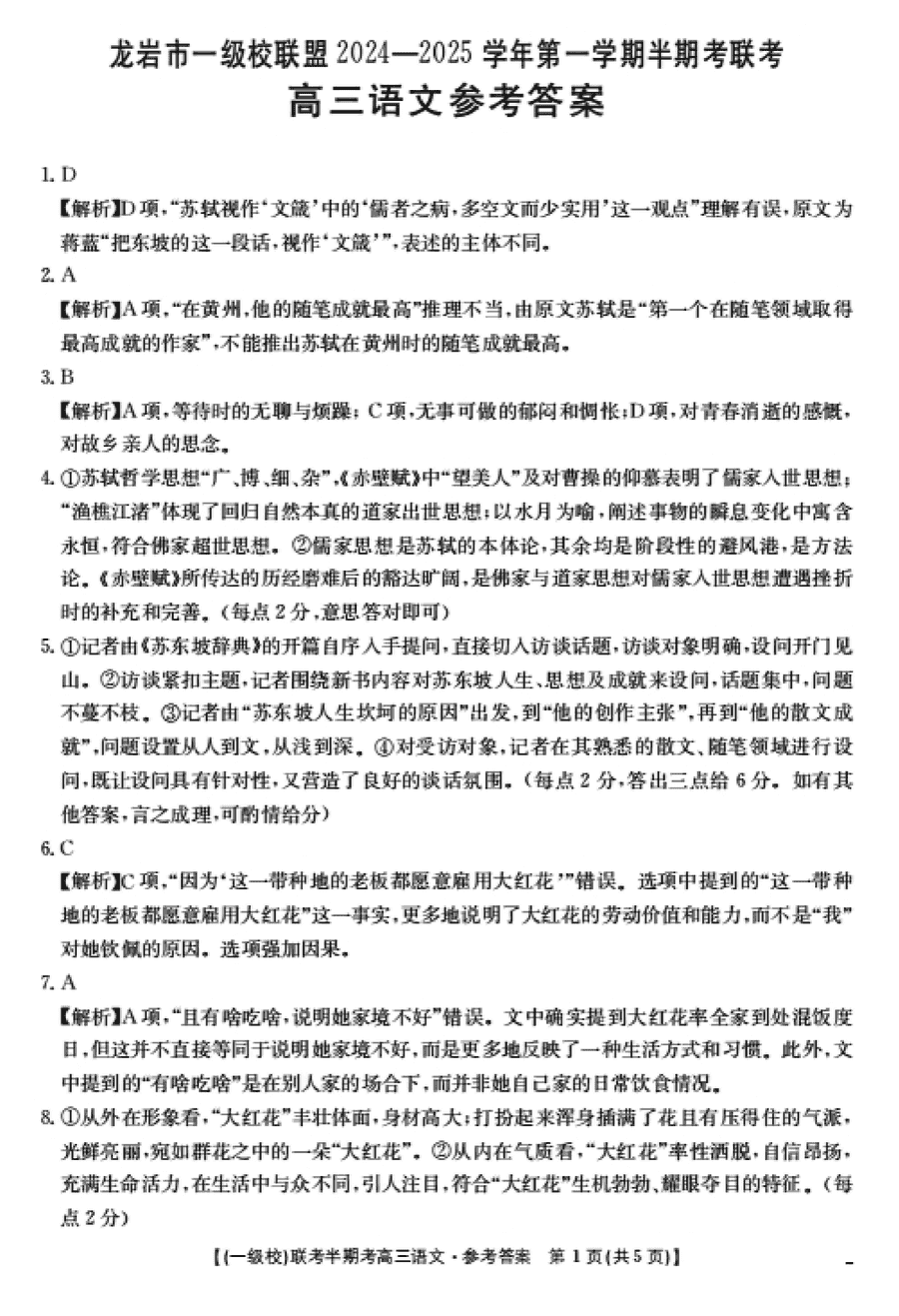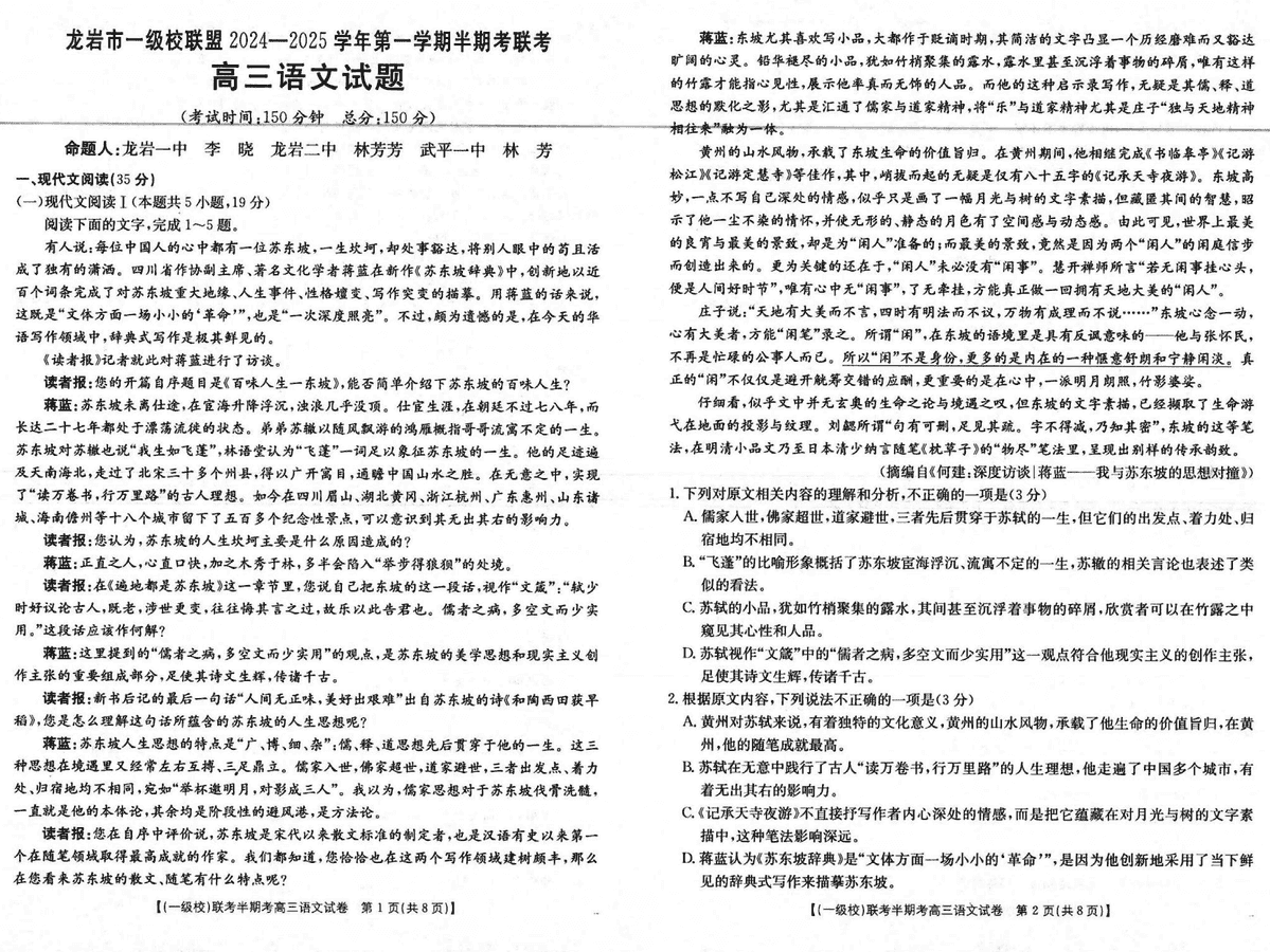 福建龙岩一级校联2025届高三上11月期中语文考试已于近日开考,为方便考生考后及时查看考试情况,查漏补缺、弥补不足,本文整理了试题答案解析相关信息!