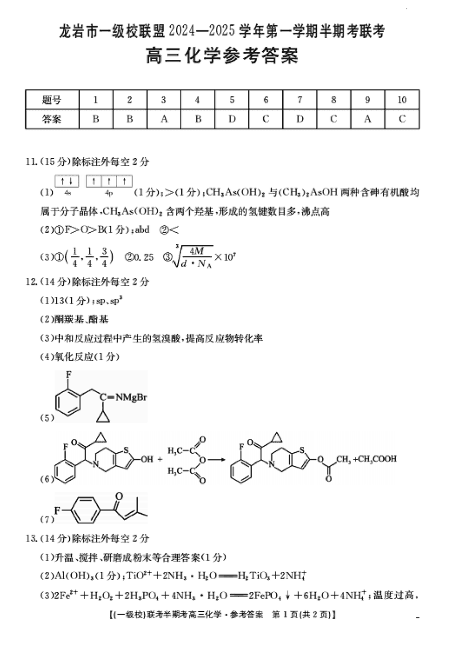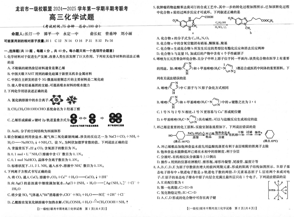 福建龙岩一级校联2025届高三上11月期中化学考试已于近日开考,为方便考生考后及时查看考试情况,查漏补缺、弥补不足,本文整理了试题答案解析相关信息!
