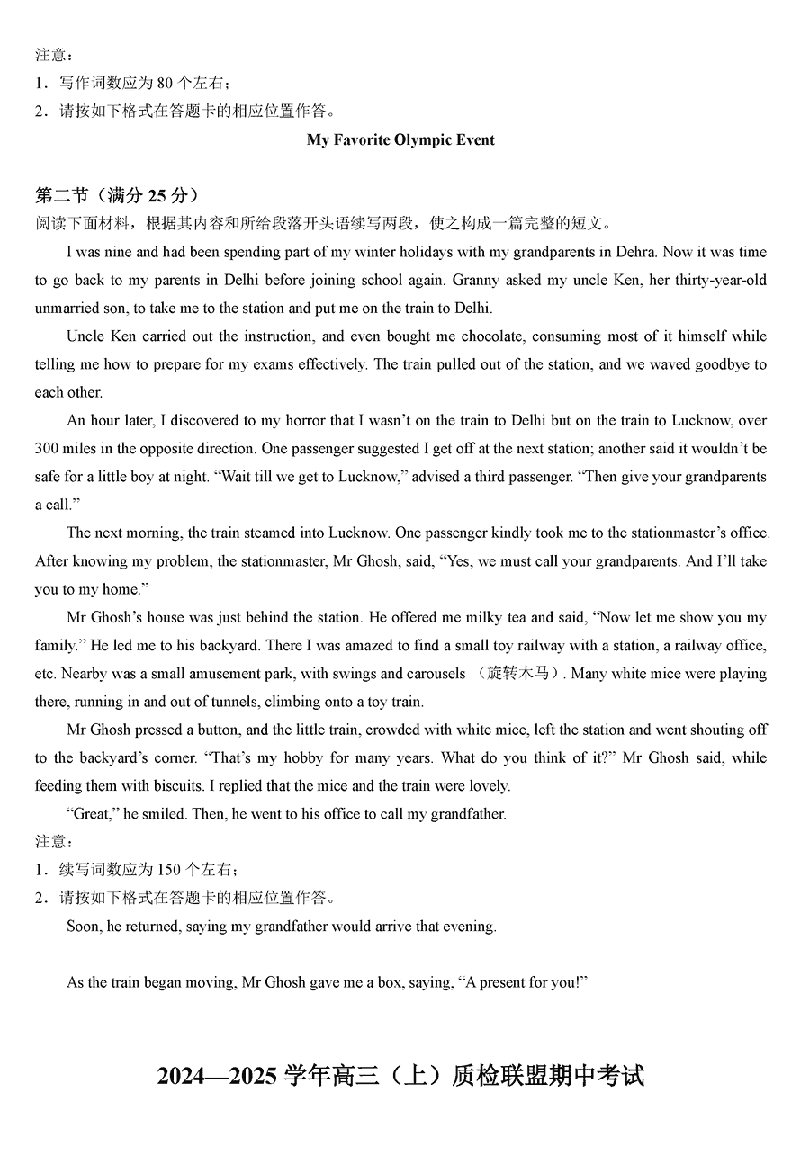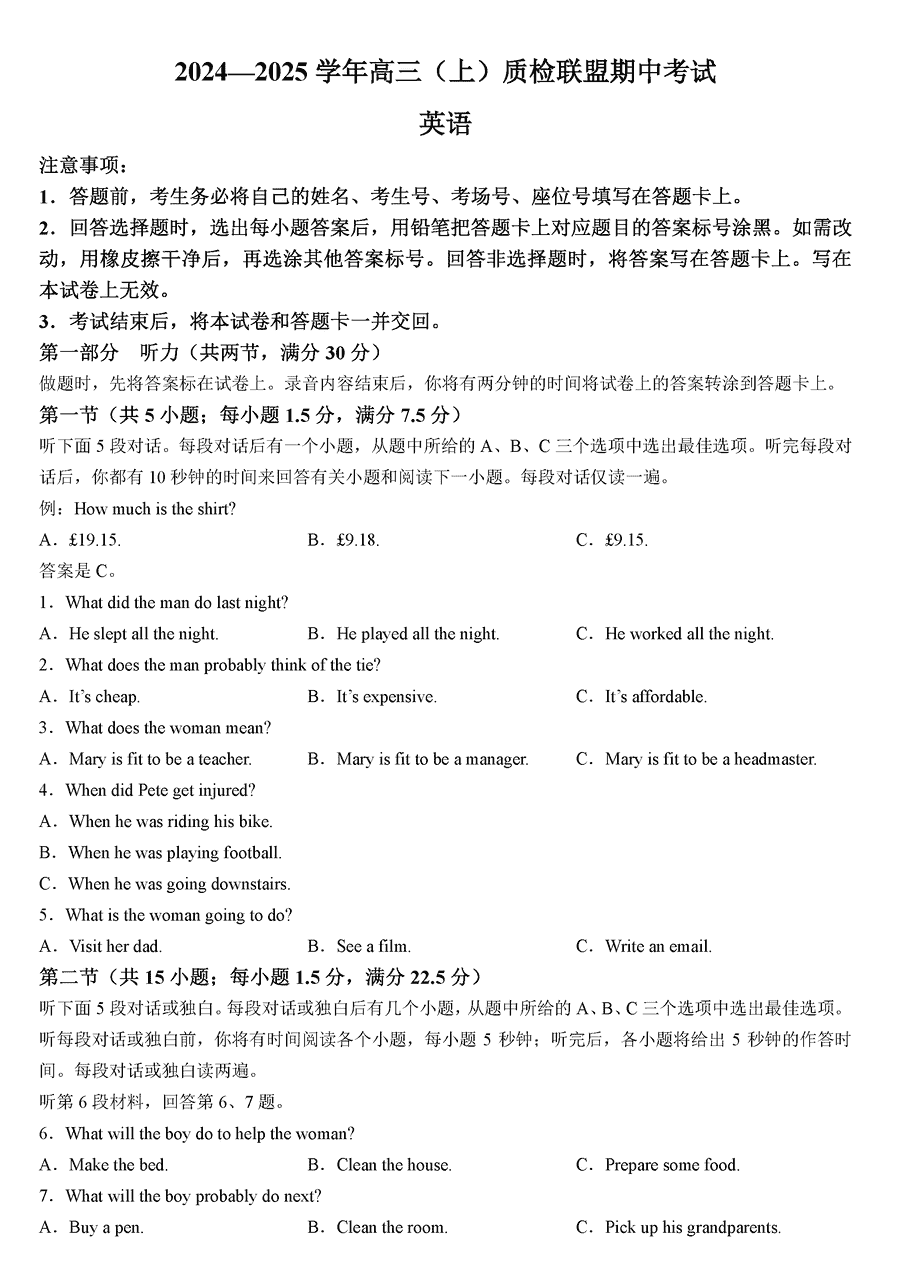 邢台市质检联盟2025届高三上11月期中英语试题及答案