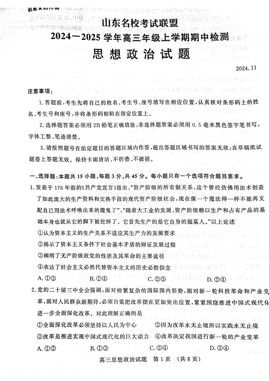 山东名校考试联盟2025届高三期中检测政治试题及答案 时间:2024-11-14 13:09 山东 文综试题 山东名校考试联盟2025届高三期中检测政治考试已于近日开考,为方便考生考后及时查看考试情况,查漏补缺、弥补不足,本文整理了试题答案解析相关信息! 汇总:山东名校考试联盟2025届高三期中检测试题及答案汇总 政治试题及答案解析