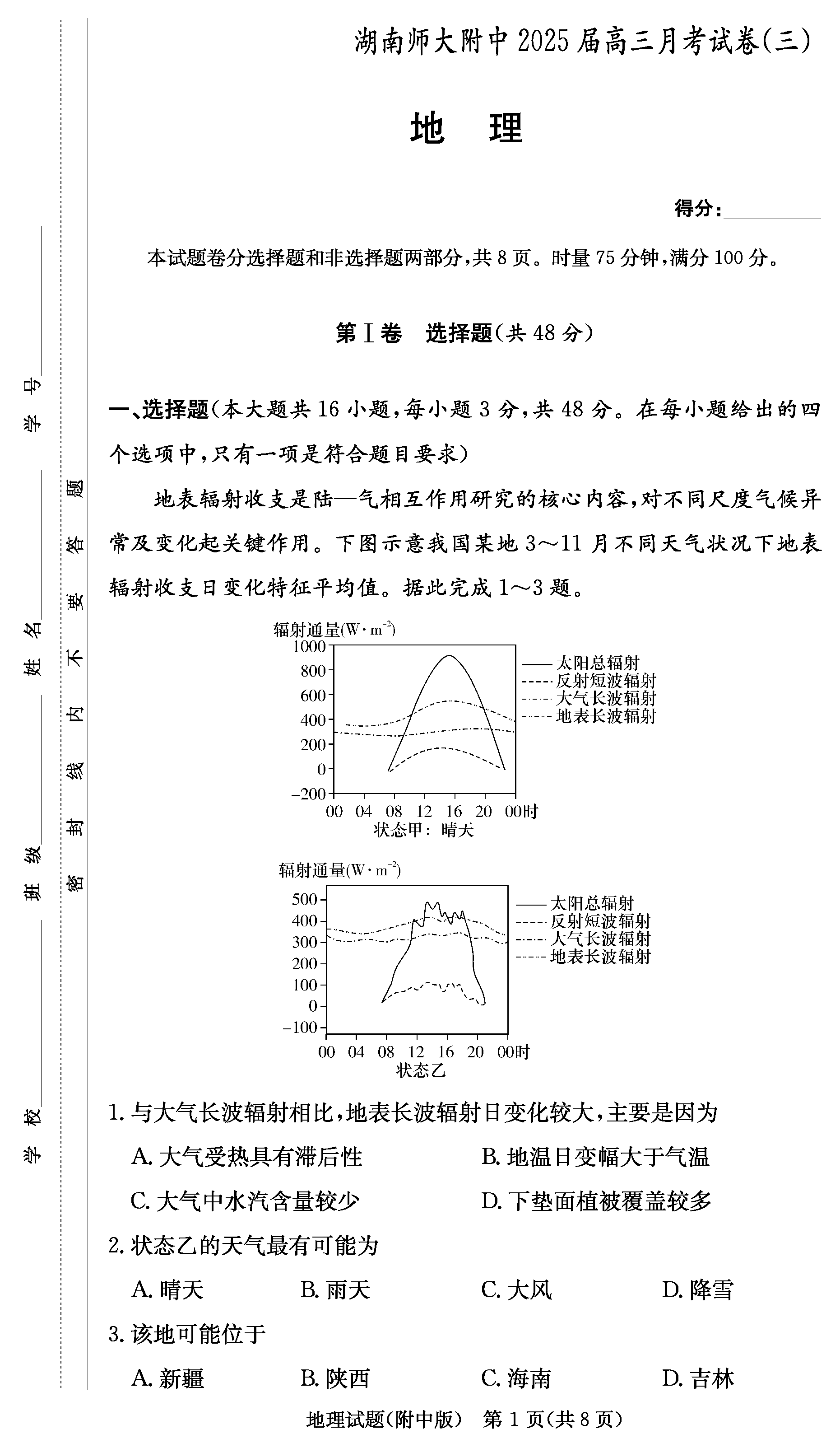 2025届湖南师大附中高三上学期月考卷(三)地理试题及答案