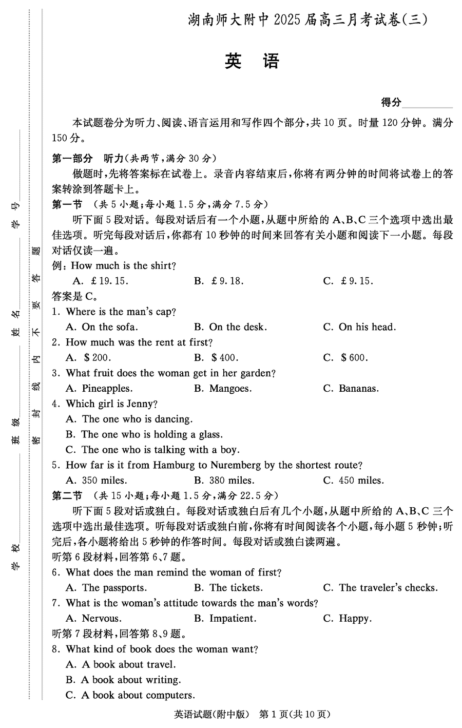 2025届湖南师大附中高三上学期月考卷(三)英语试题及答案