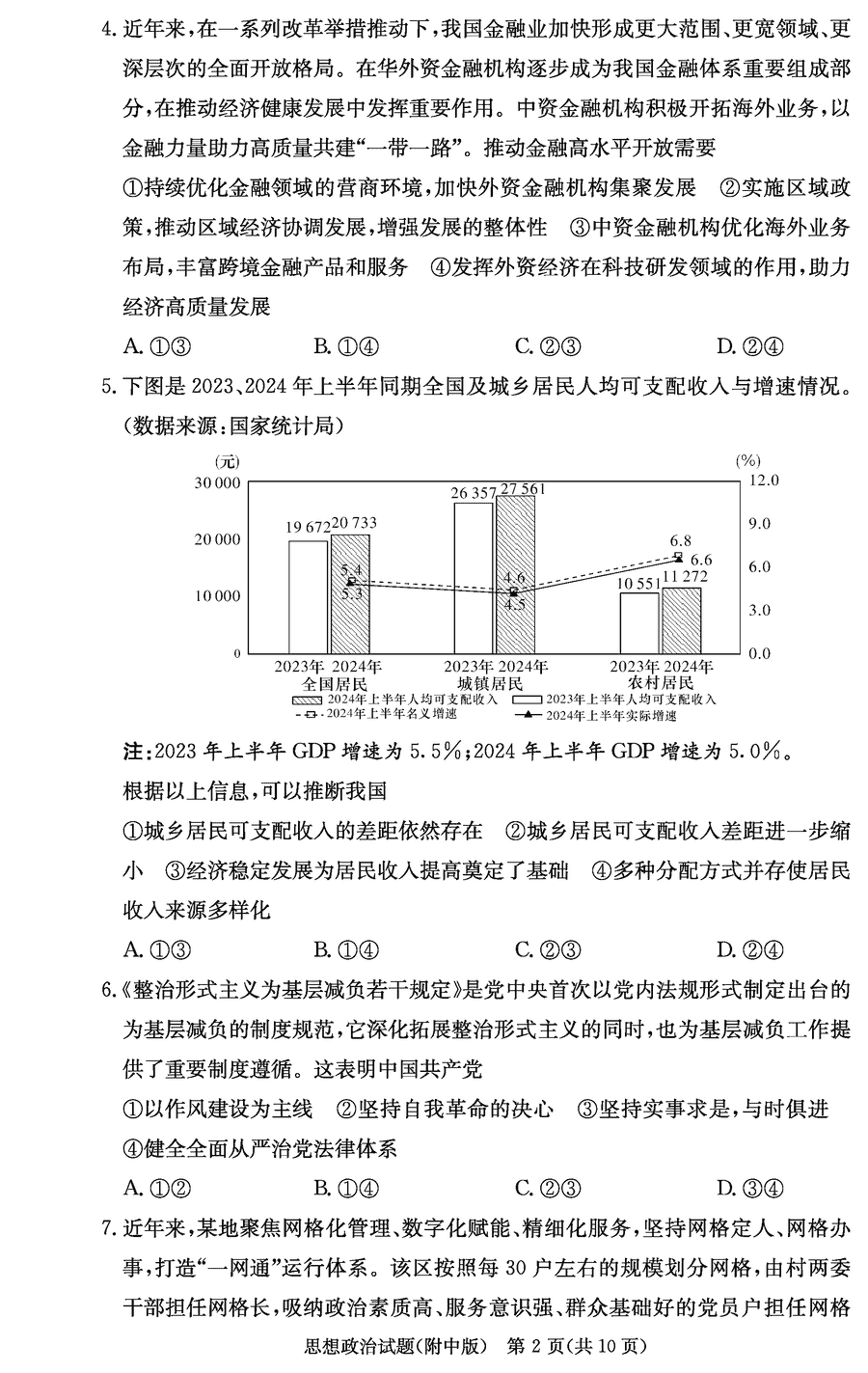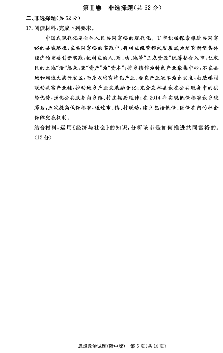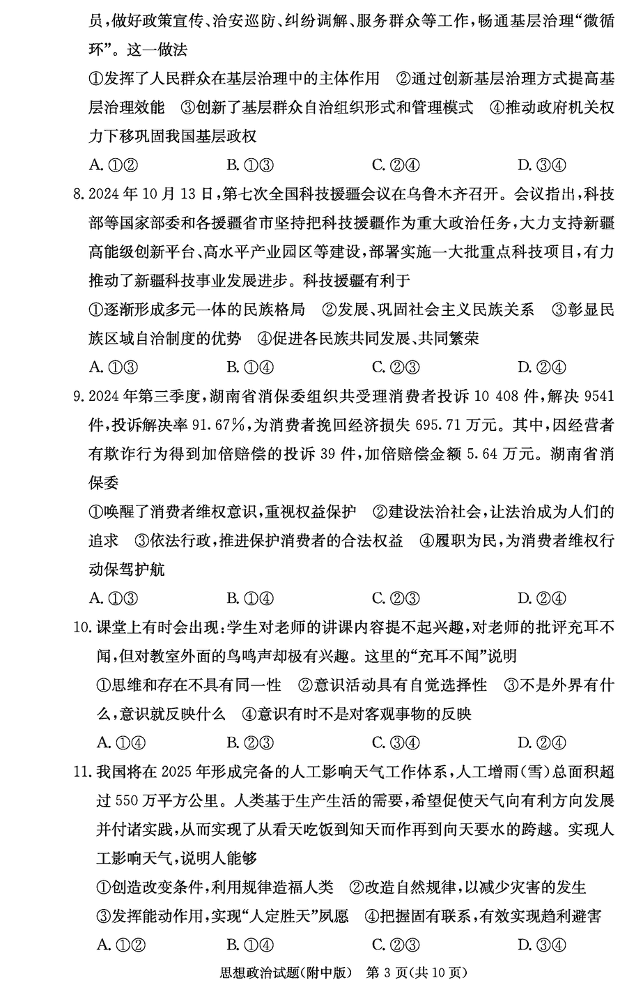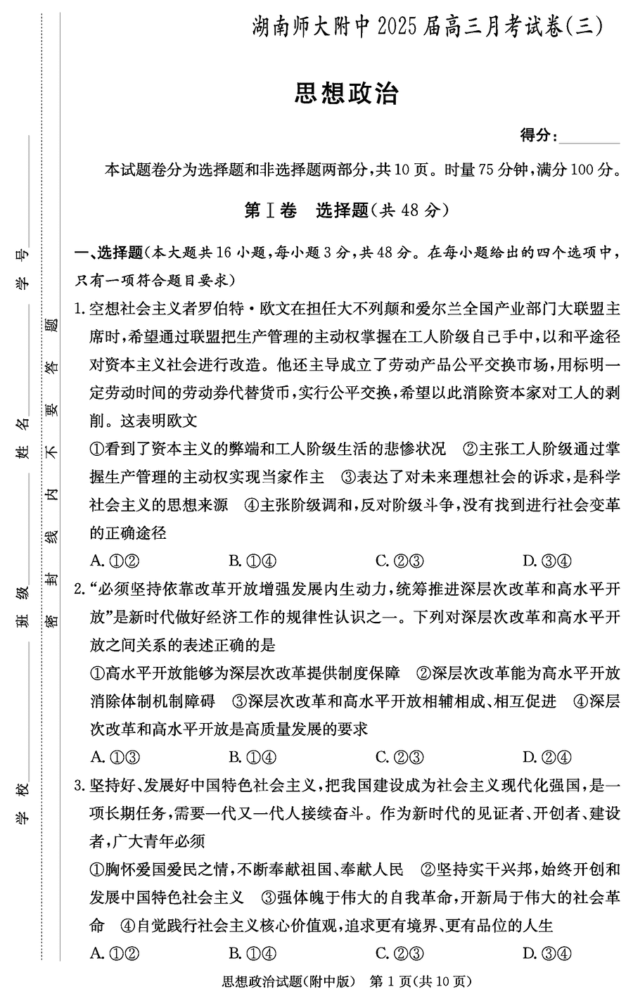 2025届湖南师大附中高三上学期月考卷(三)政治试题及答案