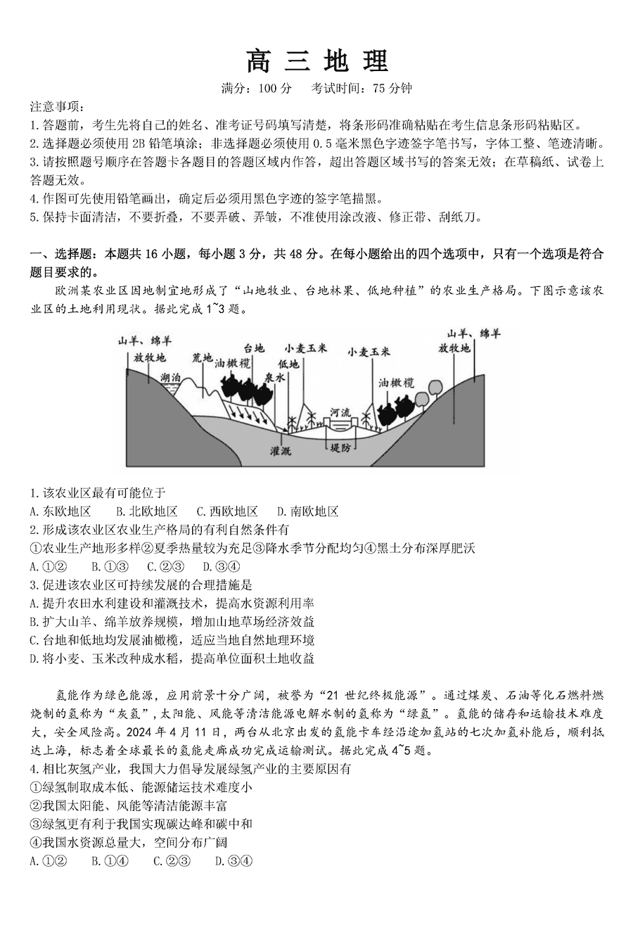 安徽省鼎尖名校联盟2025届高三上11月期中地理试题及答案