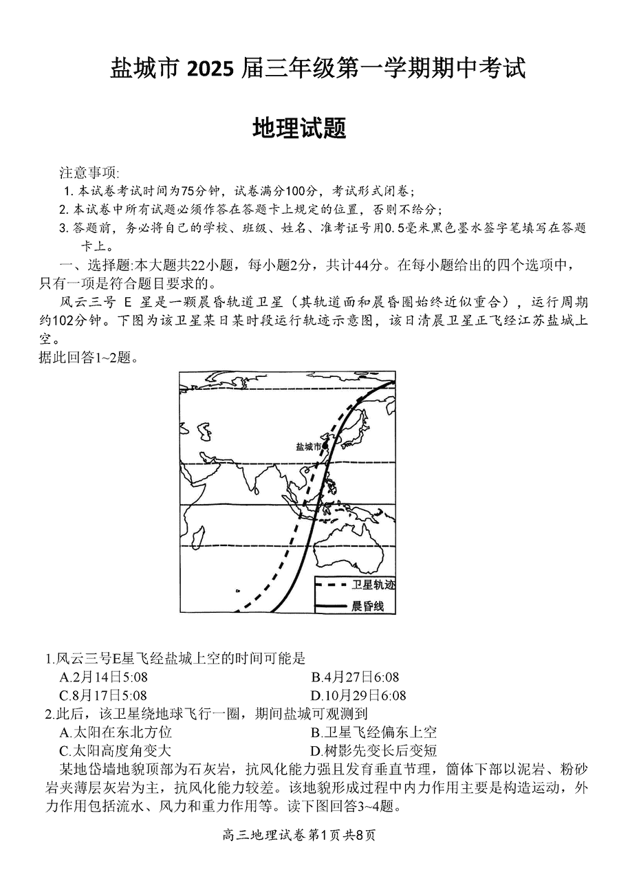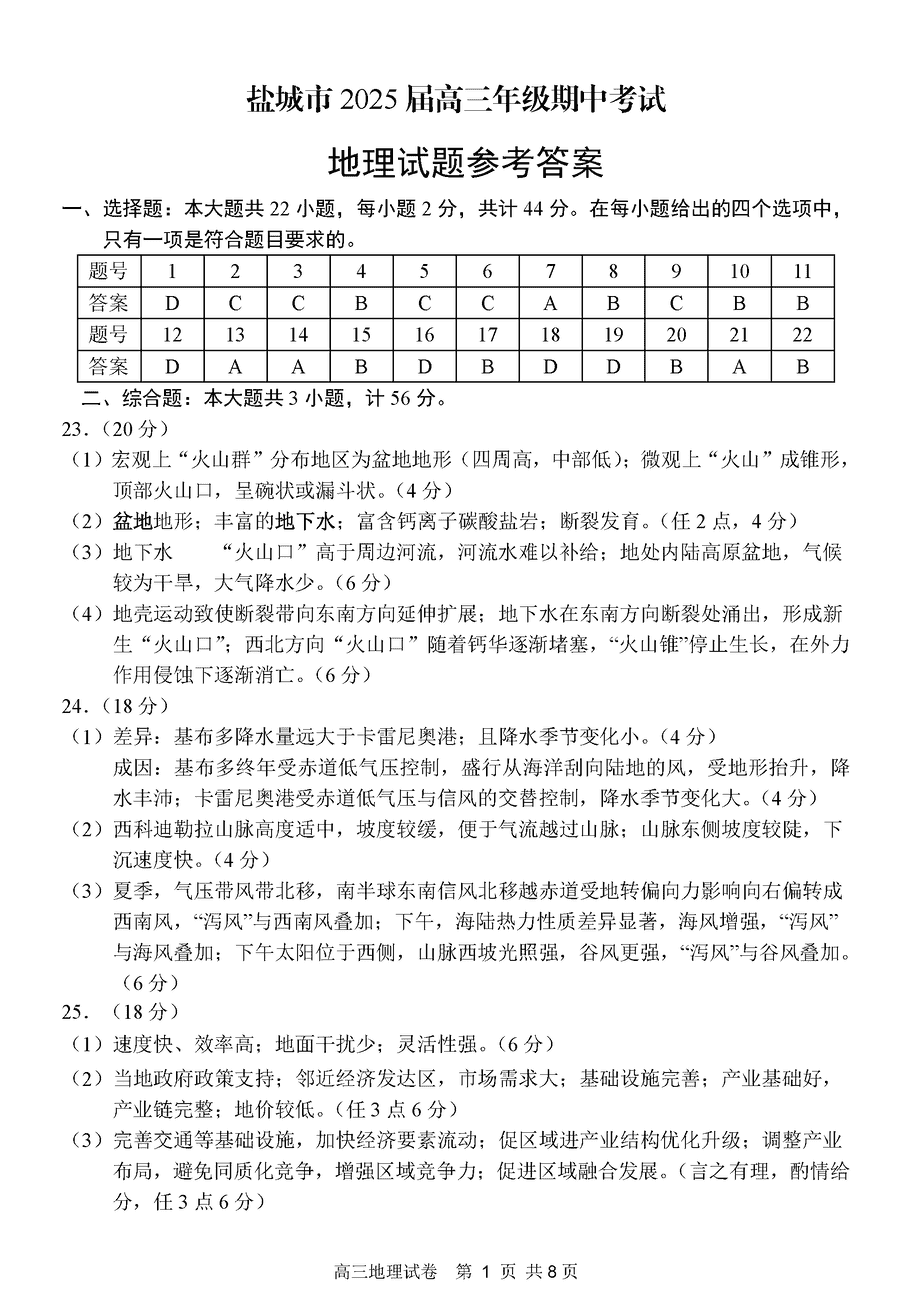 江苏盐城2025届高三上学期11月期中地理考试已于近日开考,为方便考生考后及时查看考试情况,查漏补缺、弥补不足,本文整理了试题答案解析相关信息!