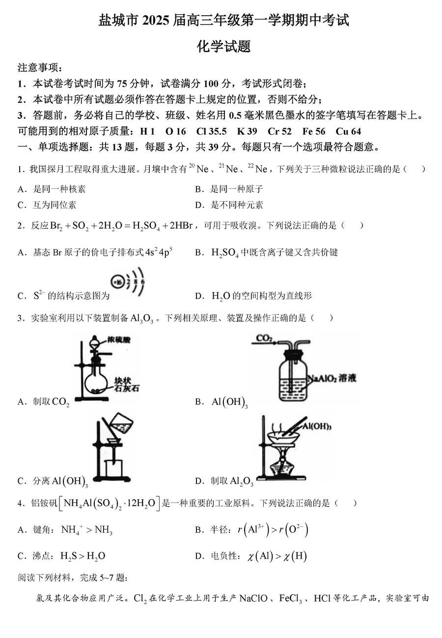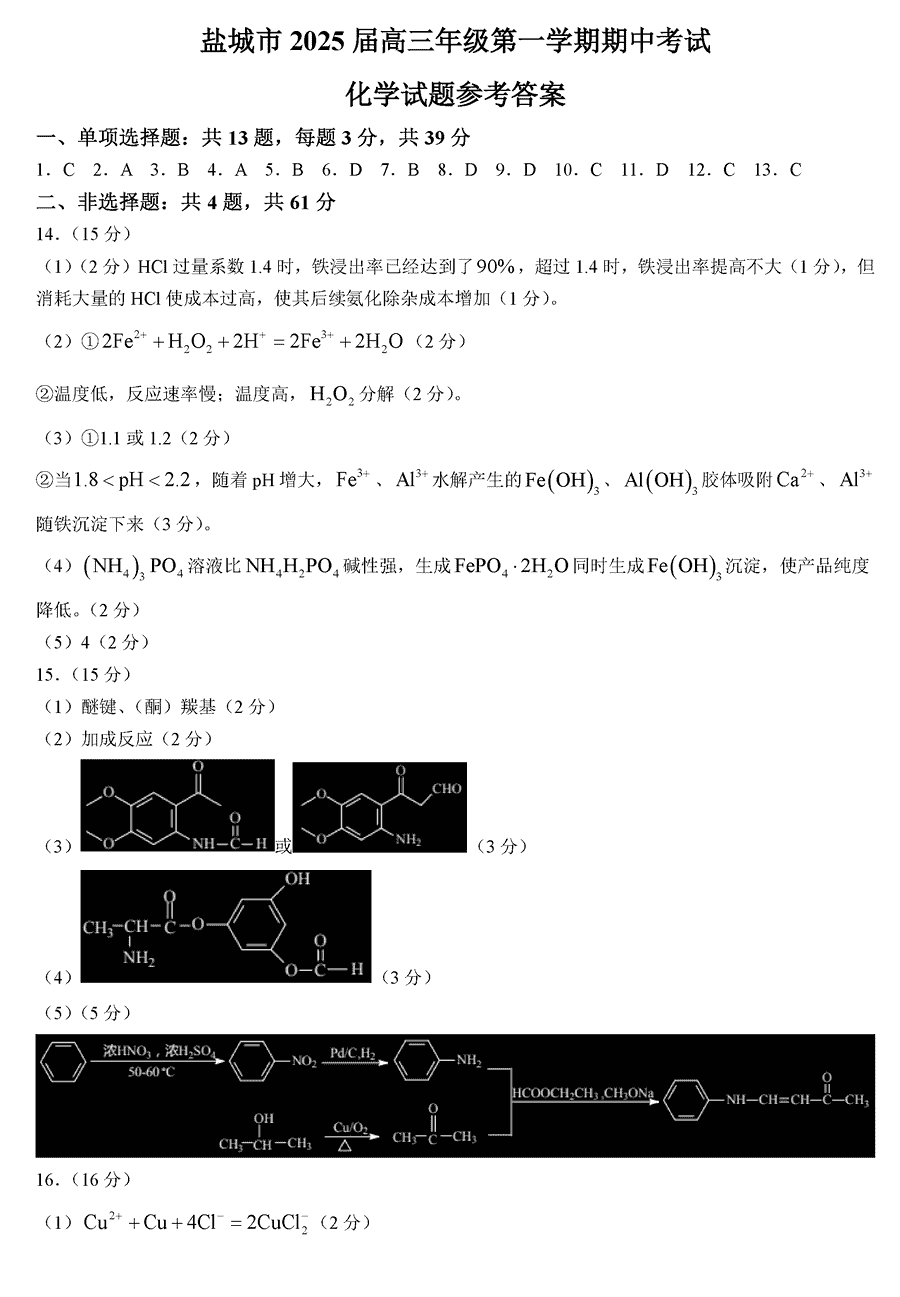 江苏盐城2025届高三上学期11月期中化学考试已于近日开考,为方便考生考后及时查看考试情况,查漏补缺、弥补不足,本文整理了试题答案解析相关信息!