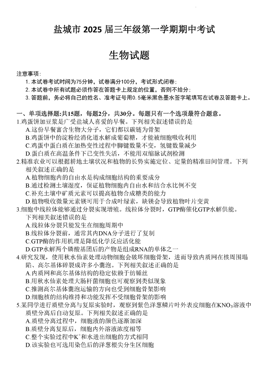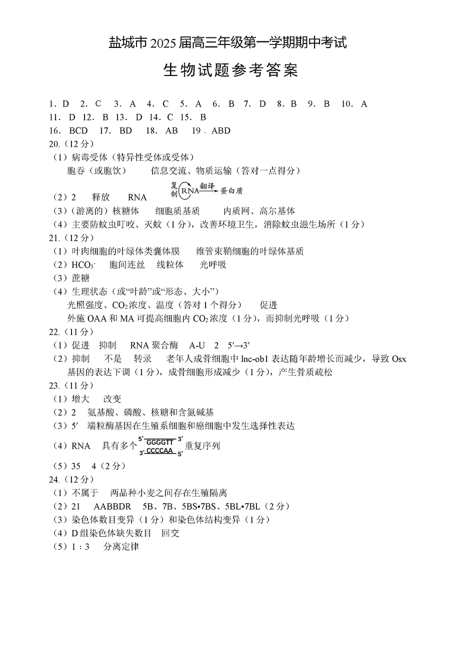 江苏盐城2025届高三上学期11月期中生物考试已于近日开考,为方便考生考后及时查看考试情况,查漏补缺、弥补不足,本文整理了试题答案解析相关信息!
