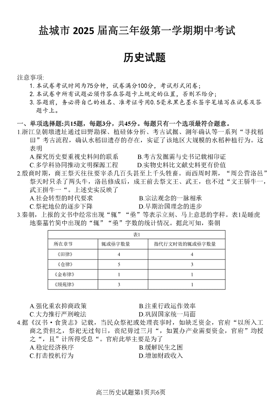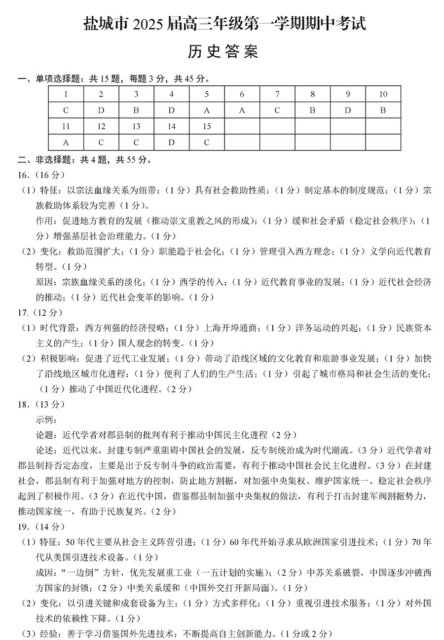 江苏盐城2025届高三上学期11月期中历史考试已于近日开考,为方便考生考后及时查看考试情况,查漏补缺、弥补不足,本文整理了试题答案解析相关信息!