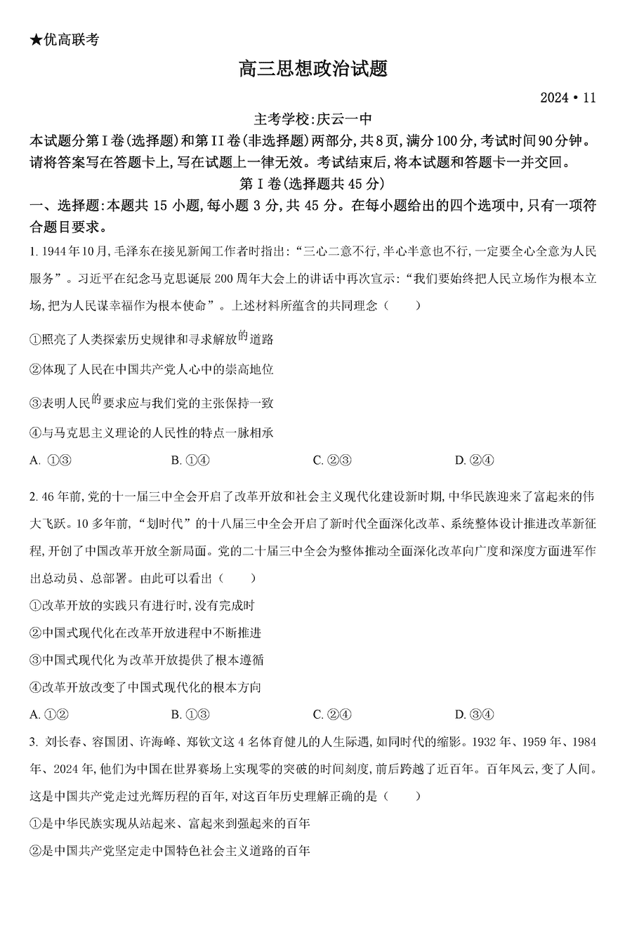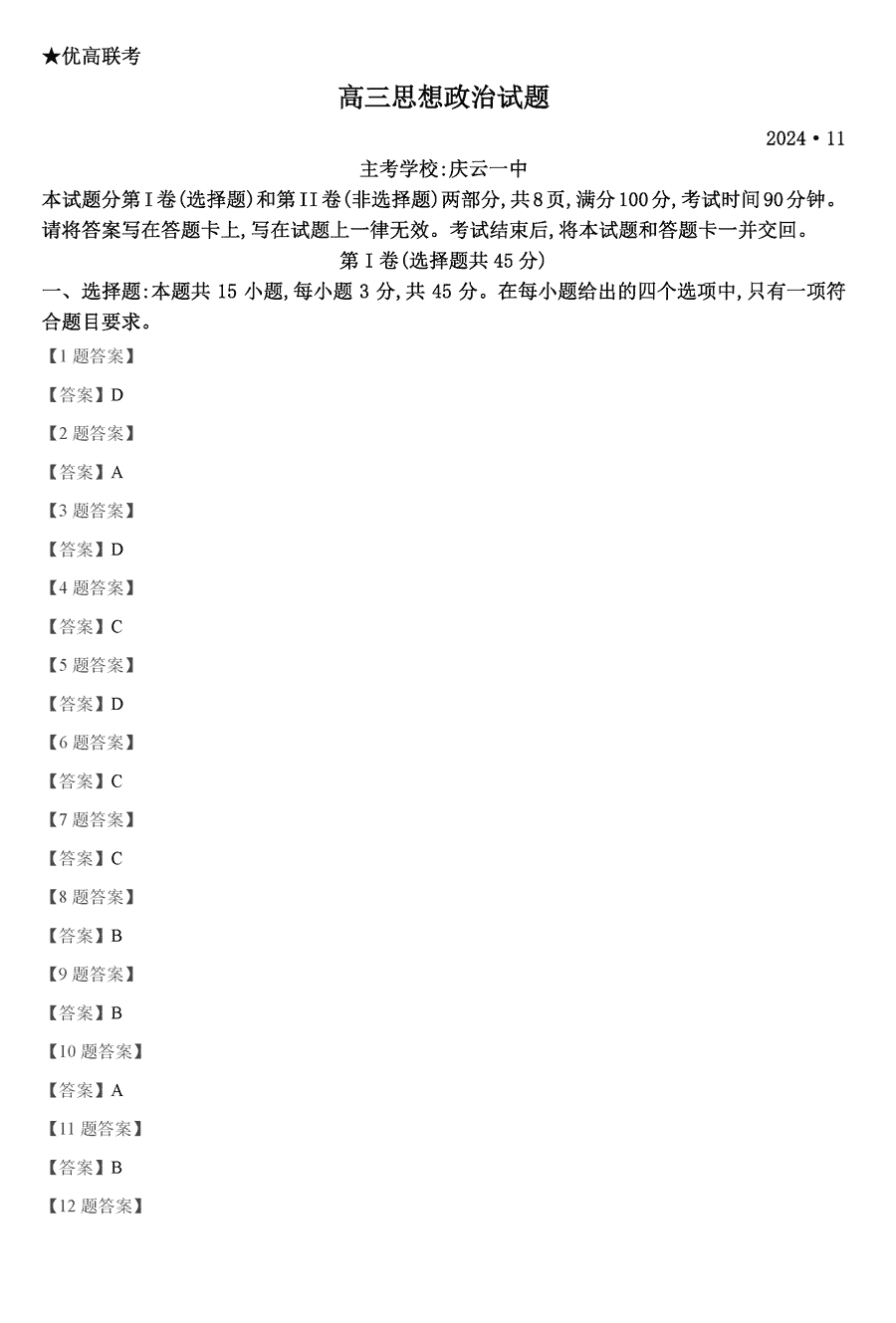 山东德州优高联考2025届高三上学期11月期中政治考试已于近日开考,为方便考生考后及时查看考试情况,查漏补缺、弥补不足,本文整理了试题答案解析相关信息!