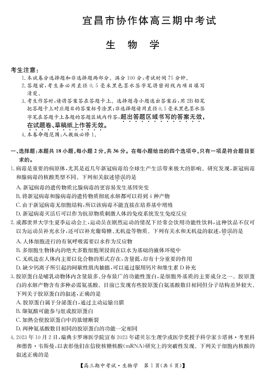 湖北宜昌协作体2025届高三11月期中生物试题及答案