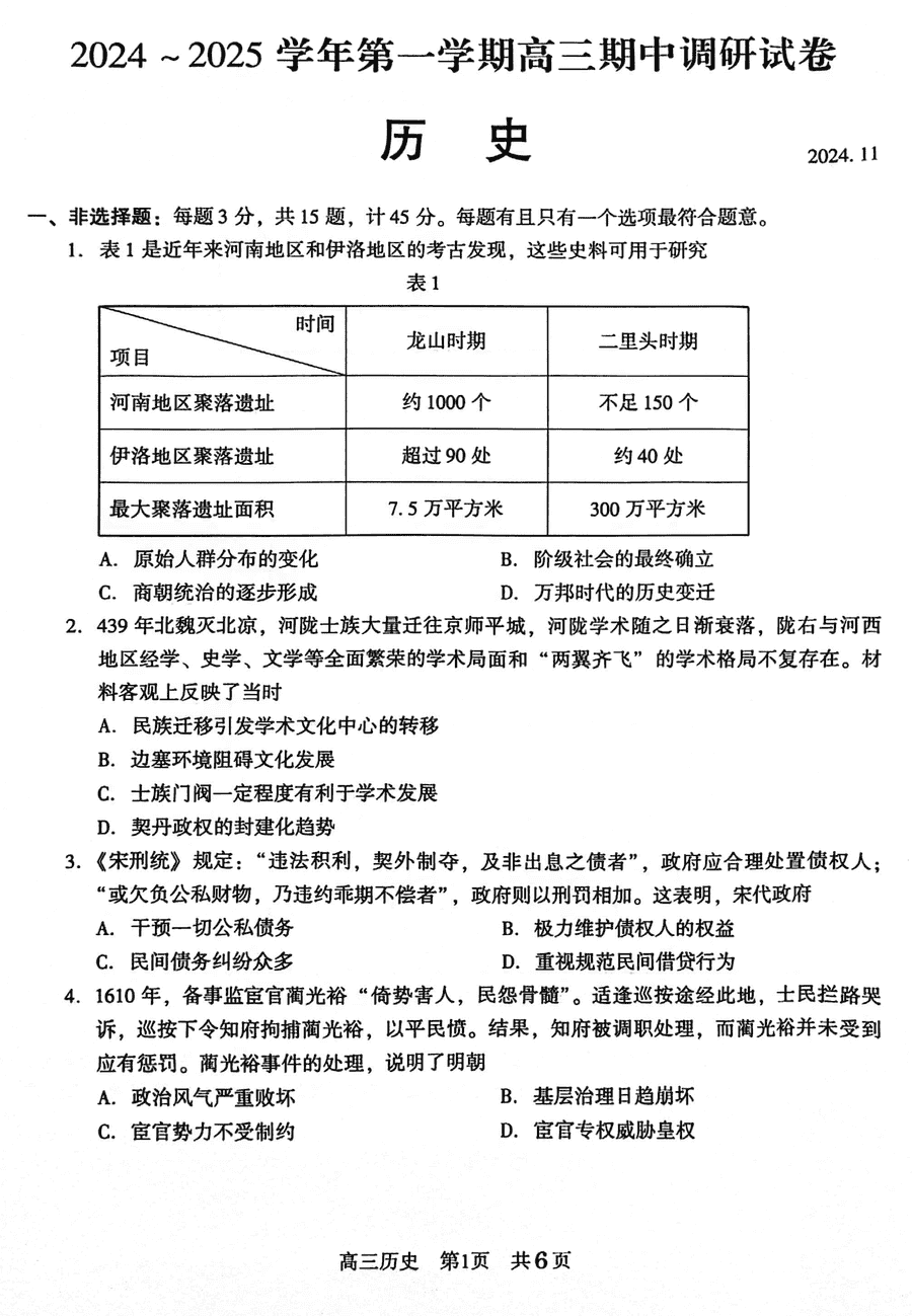 苏州2024-2025学年高三上学期11月期中历史试题及答案