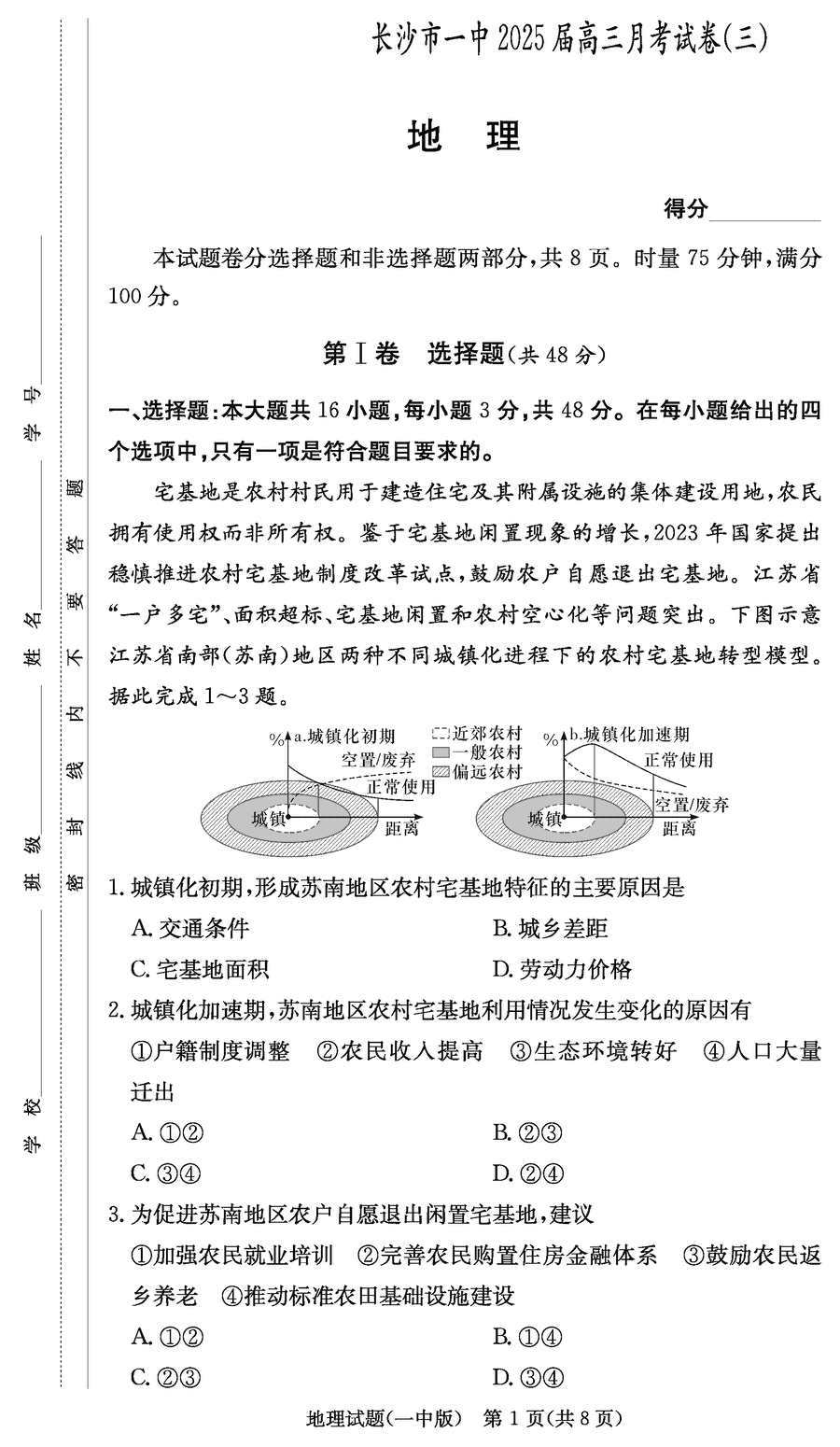 湖南长沙一中2025届高三月考试卷(三)地理试题及答案