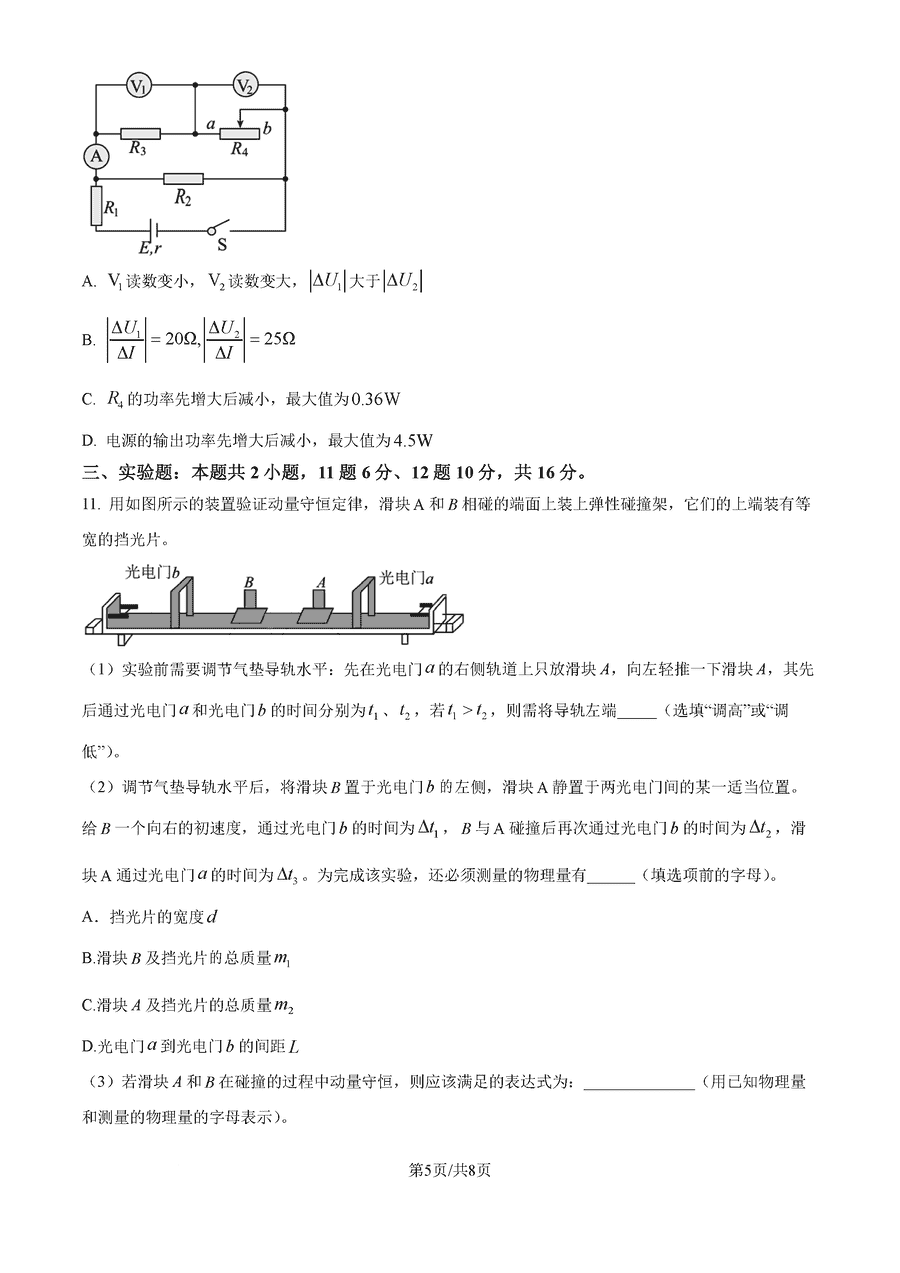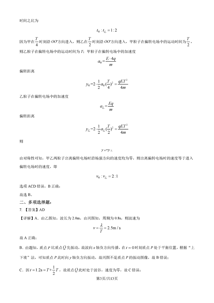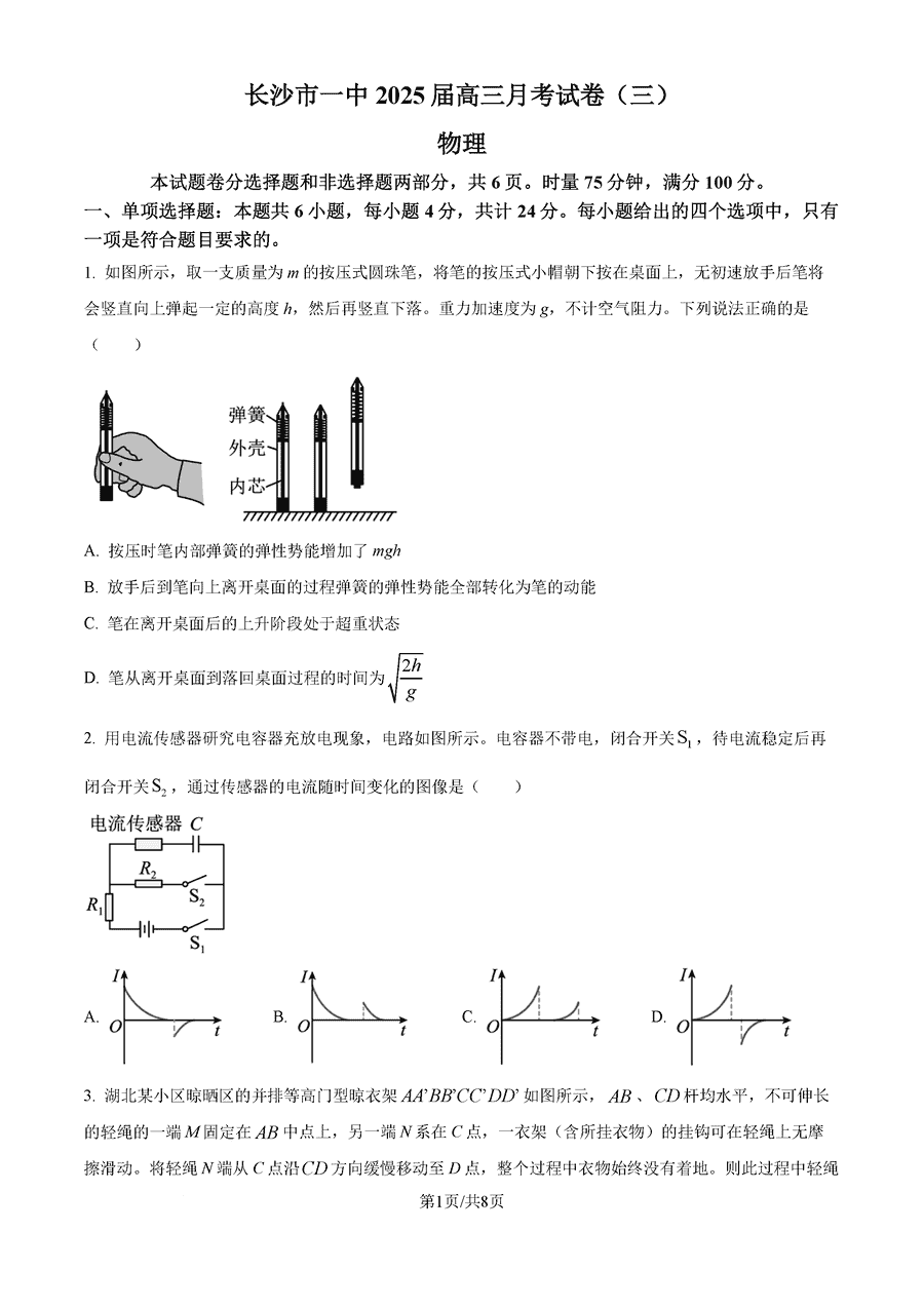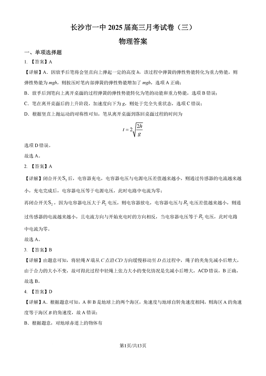 湖南长沙一中2025届高三月考试卷(三)物理试题及答案