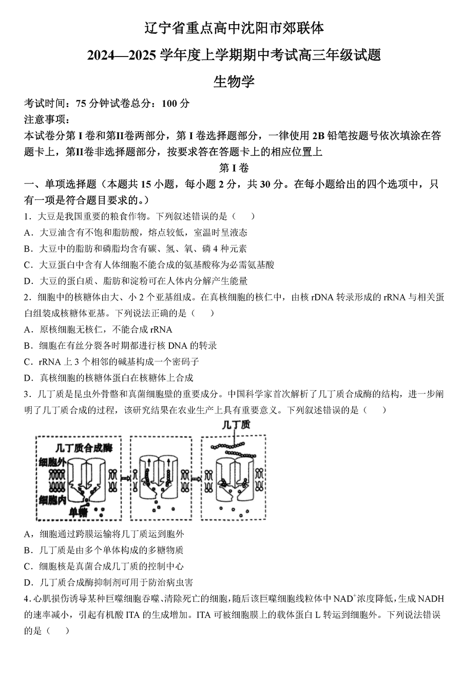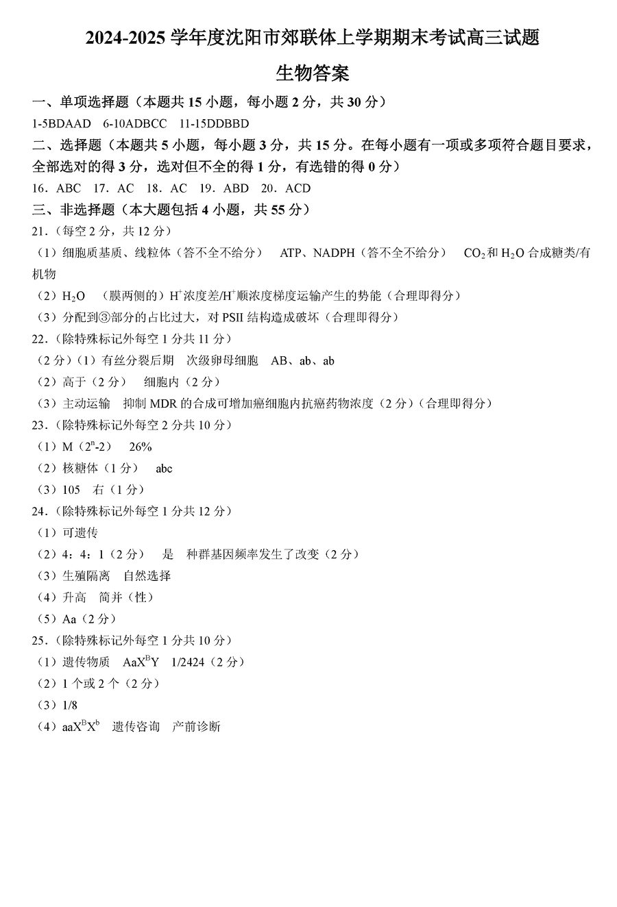 沈阳市郊联体2024-2025学年高三上11月期中生物试题及答案