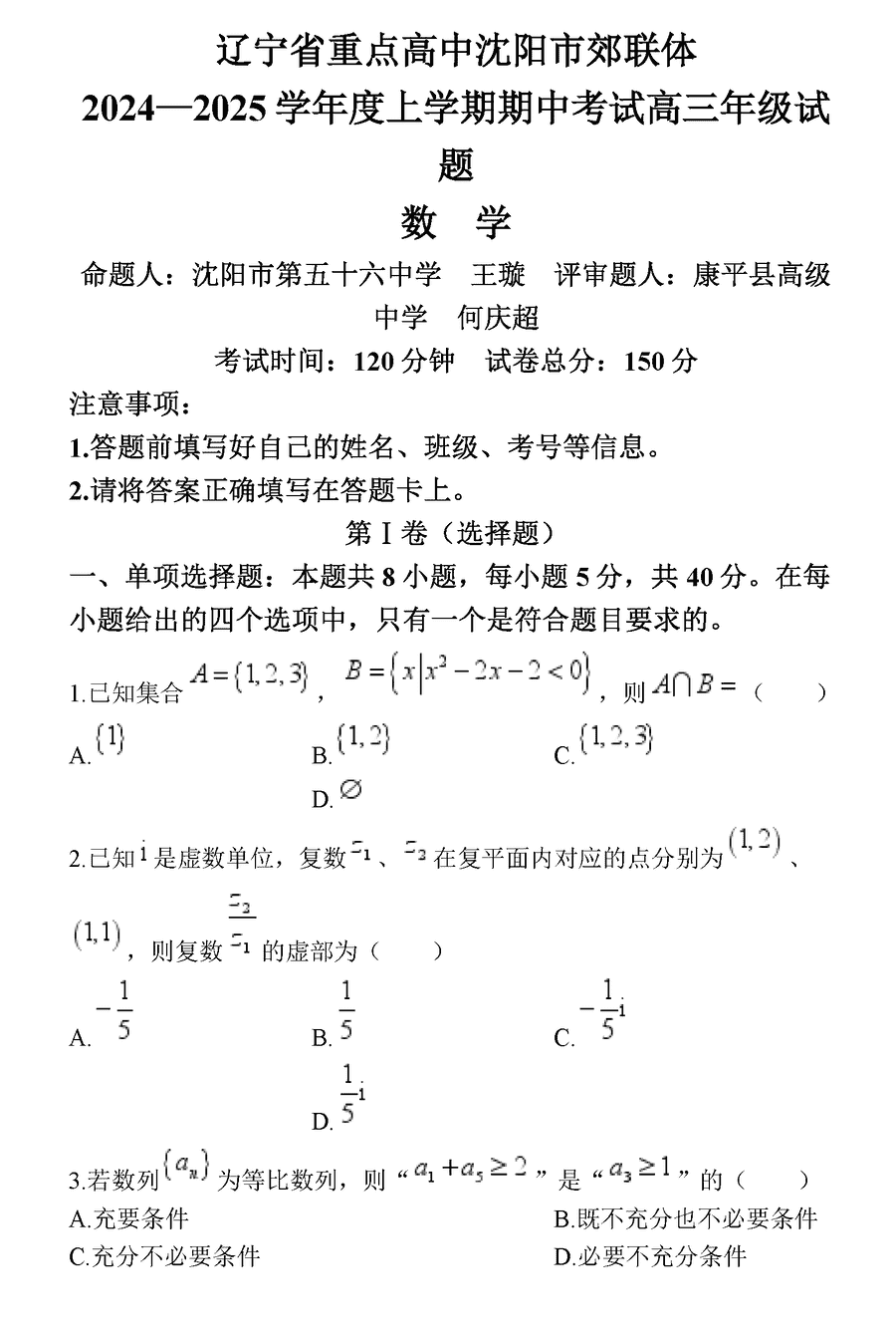 沈阳市郊联体2024-2025学年高三上学期11月期中数学考试已于近日开考,为方便考生考后及时查看考试情况,查漏补缺、弥补不足,本文整理了试题答案解析相关信息!