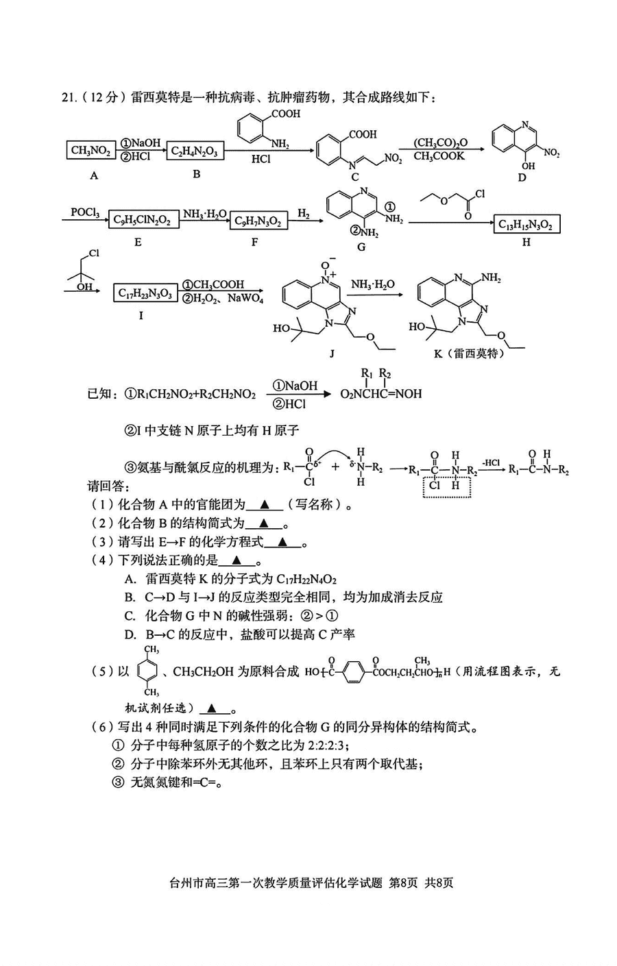 台州市2025届高三第一次教学质量评估化学试题及答案 时间:2024-11-17 01:54 浙江 理综试题 2025届江西省九校联考高三上学期11月期中化学考试已于近日开考,为方便考生考后及时查看考试情况,查漏补缺、弥补不足,本文整理了试题答案解析相关信息! 汇总:台州市2025届高三第一次教学质量评估试题及答案汇总 化学试题及答案解析