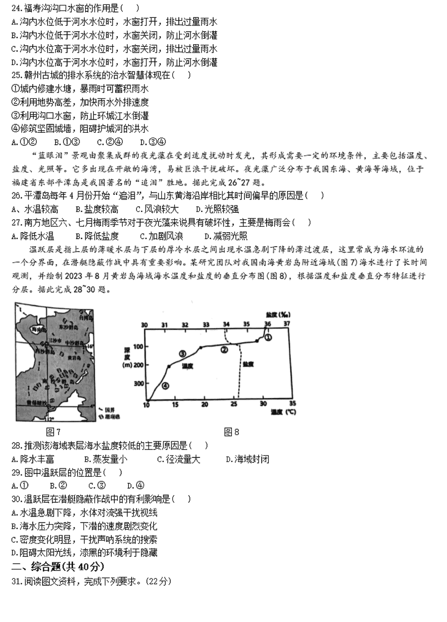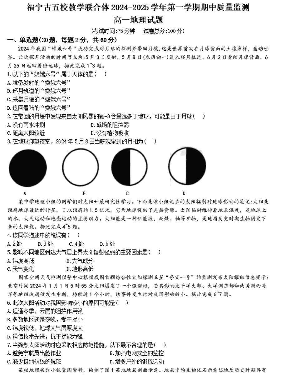 福宁古五校教学联合体2024-2025学年高一上学期期中地理试题及答案